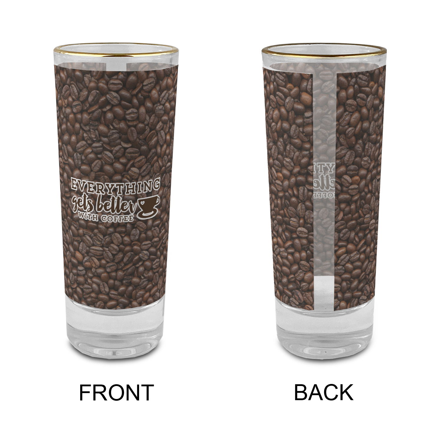 These glass shooter glasses are printed in full color with the design of your choice. These are a tall shooter 2 oz size and stand 4" tall. The print is a full wrap design to boldly display your personalization.