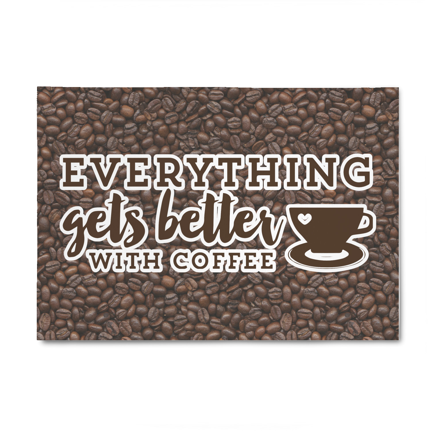 This design has a fun realistic picture of coffee beans for the background. On top of that is a fun quote saying that "everything gets better with coffee." The coordinating design has the words "coffee addict." There are also plenty of other coffee quotes to choose from in our design center.