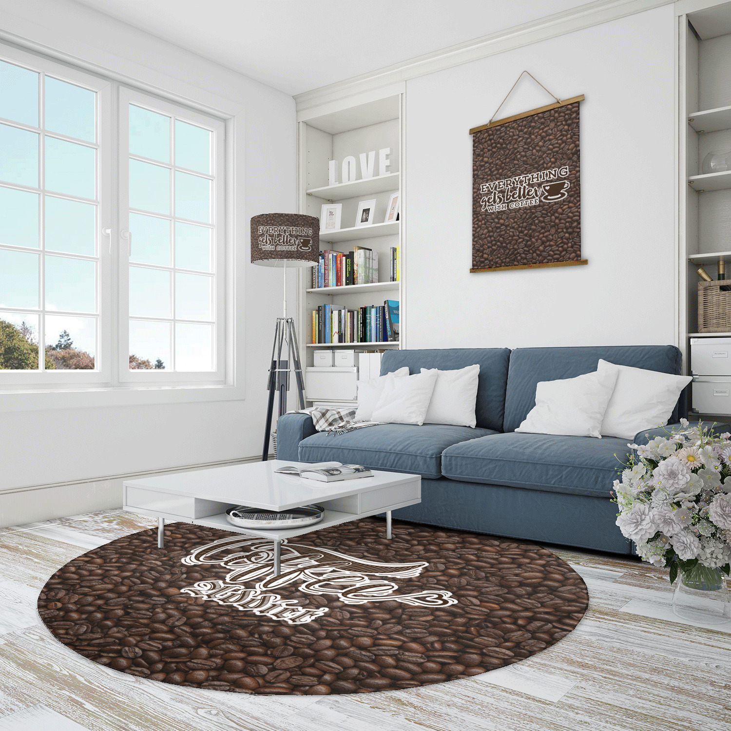 This design has a fun realistic picture of coffee beans for the background. On top of that is a fun quote saying that "everything gets better with coffee." The coordinating design has the words "coffee addict." There are also plenty of other coffee quotes to choose from in our design center.