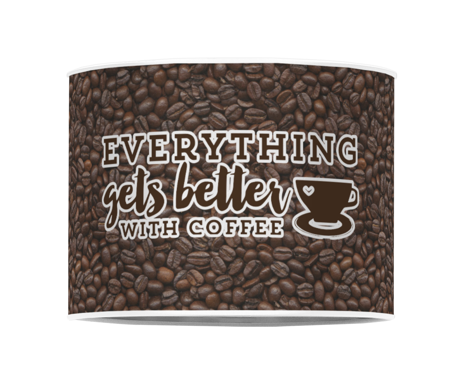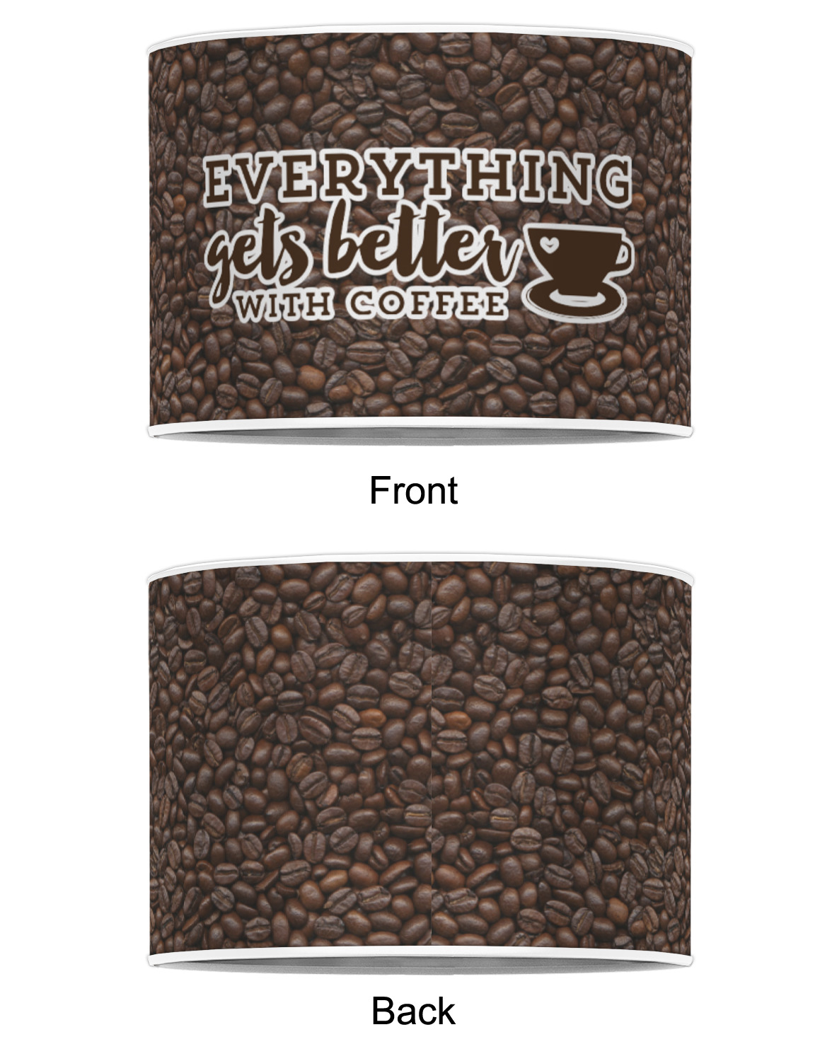 This design has a fun realistic picture of coffee beans for the background. On top of that is a fun quote saying that "everything gets better with coffee." The coordinating design has the words "coffee addict." There are also plenty of other coffee quotes to choose from in our design center.