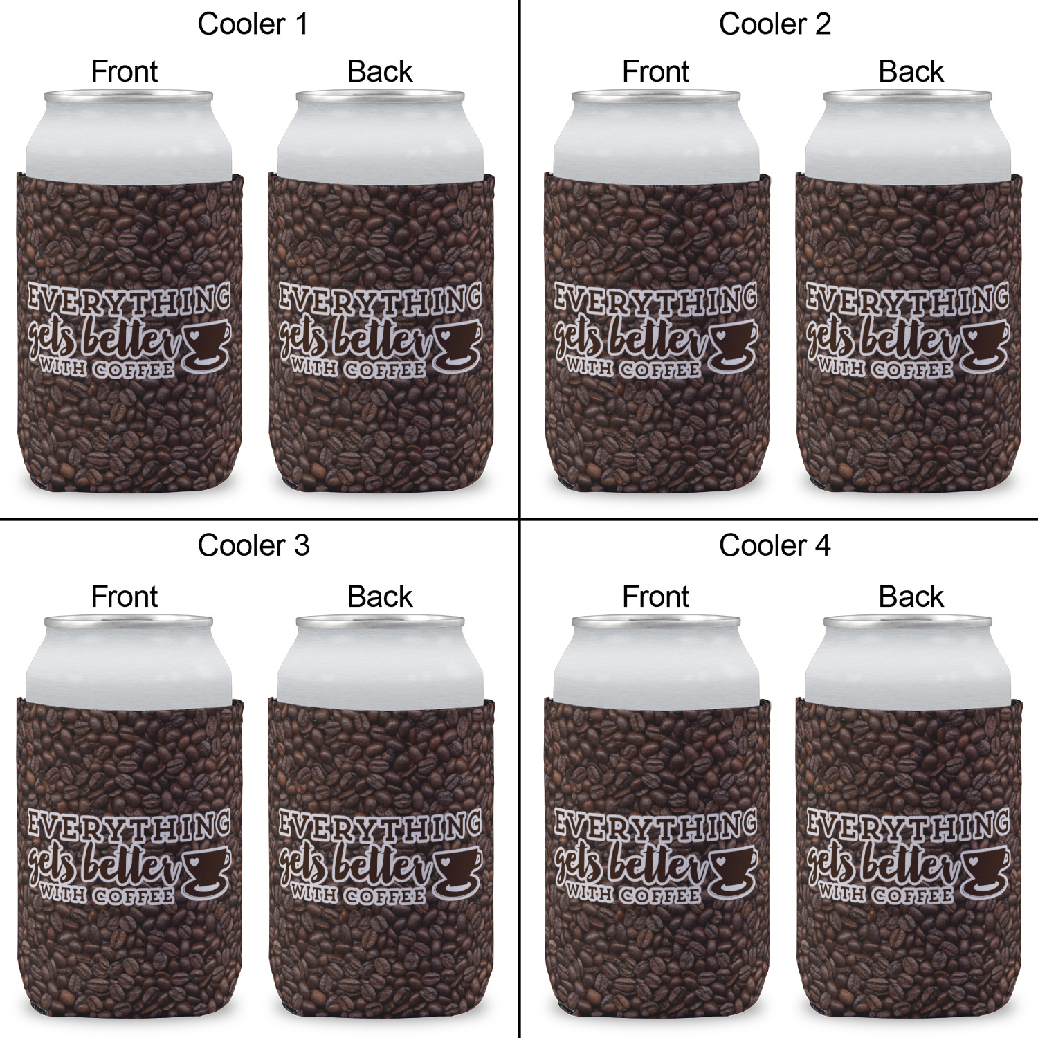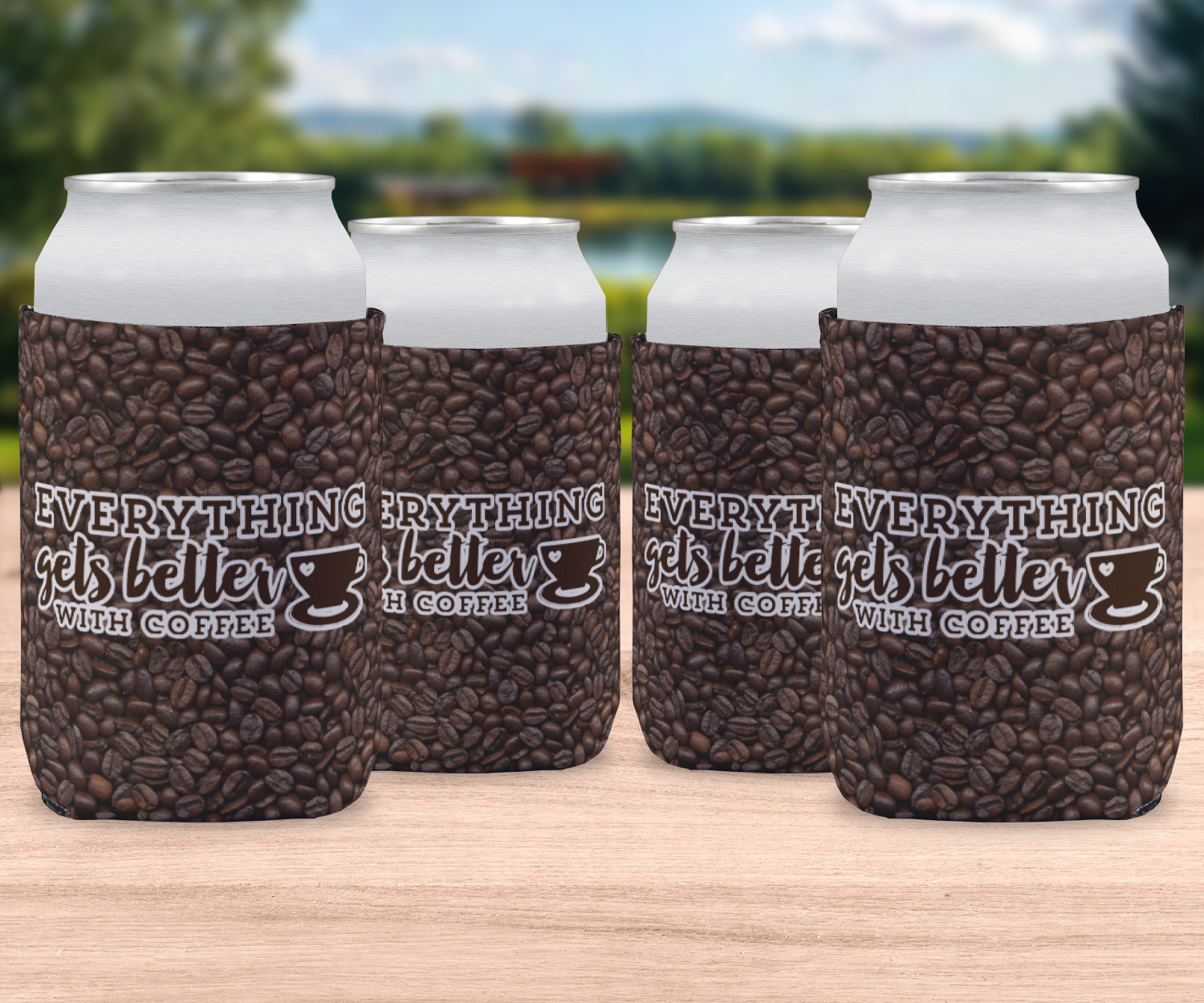 This design has a fun realistic picture of coffee beans for the background. On top of that is a fun quote saying that "everything gets better with coffee." The coordinating design has the words "coffee addict." There are also plenty of other coffee quotes to choose from in our design center.