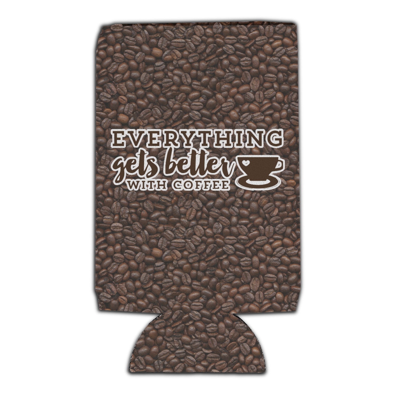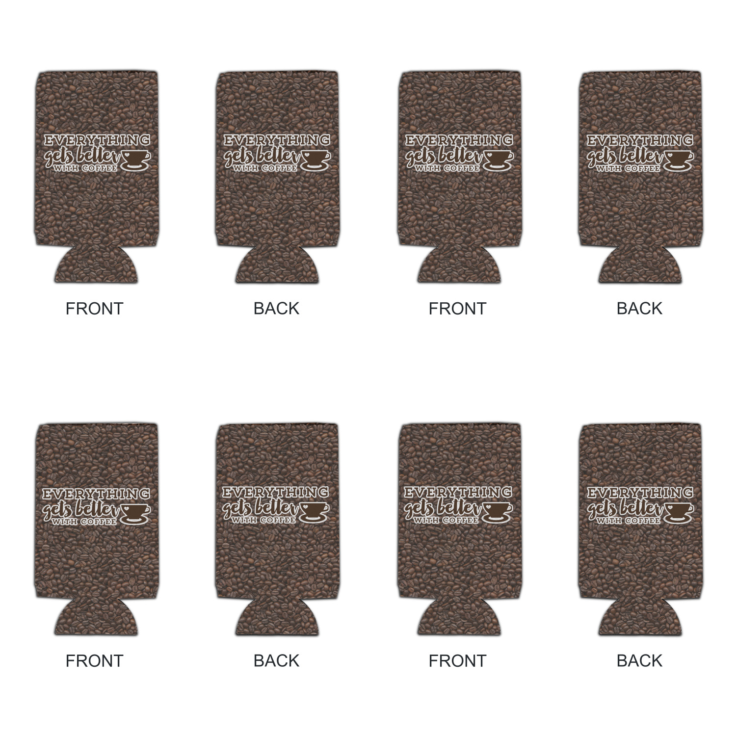 This design has a fun realistic picture of coffee beans for the background. On top of that is a fun quote saying that "everything gets better with coffee." The coordinating design has the words "coffee addict." There are also plenty of other coffee quotes to choose from in our design center.