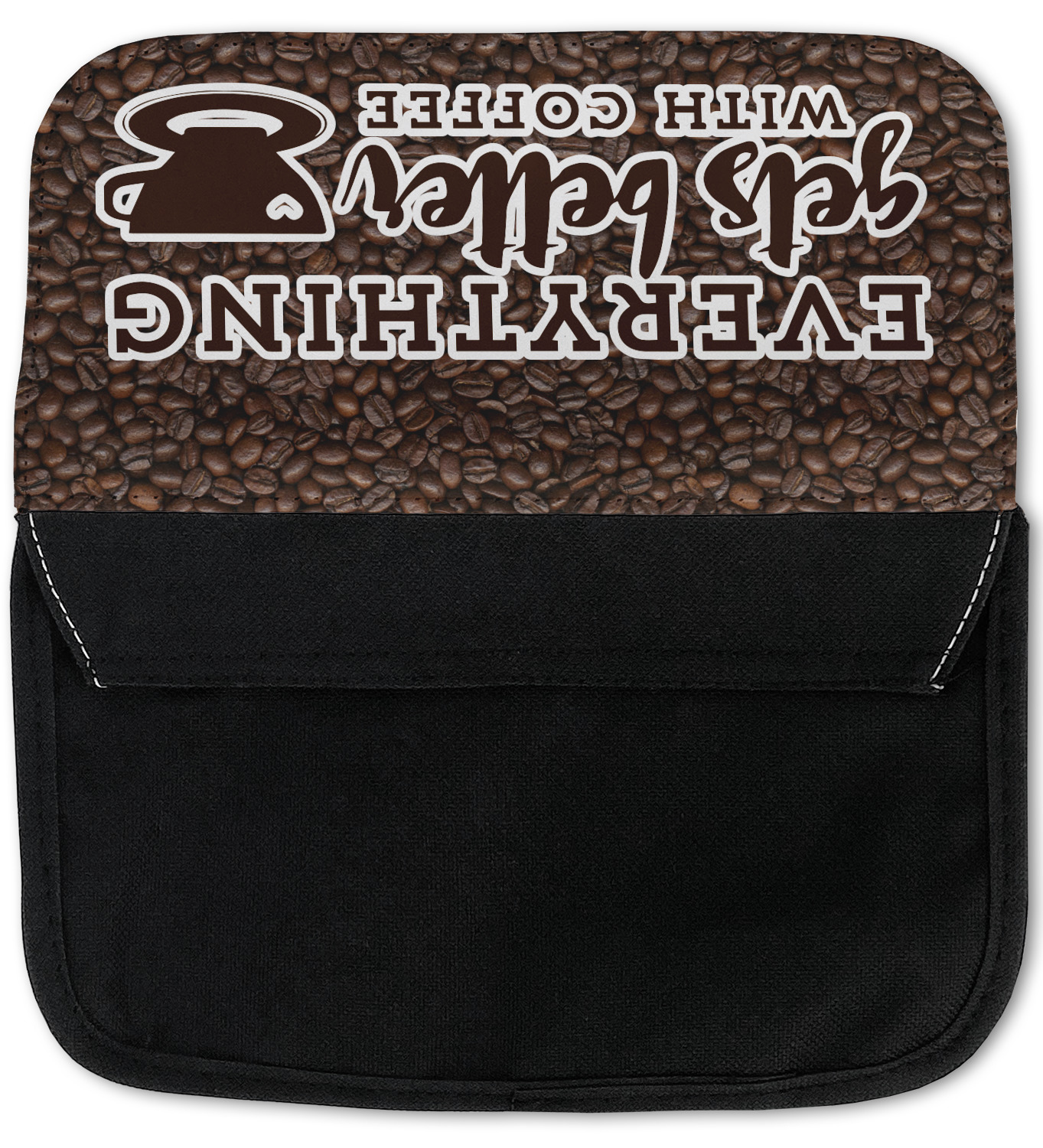 This design has a fun realistic picture of coffee beans for the background. On top of that is a fun quote saying that "everything gets better with coffee." The coordinating design has the words "coffee addict." There are also plenty of other coffee quotes to choose from in our design center.