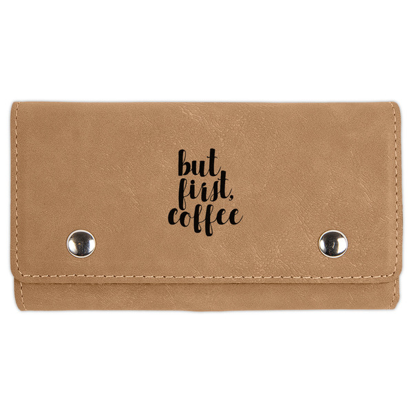 This design has a fun realistic picture of coffee beans for the background. On top of that is a fun quote saying that "everything gets better with coffee." The coordinating design has the words "coffee addict." There are also plenty of other coffee quotes to choose from in our design center.
