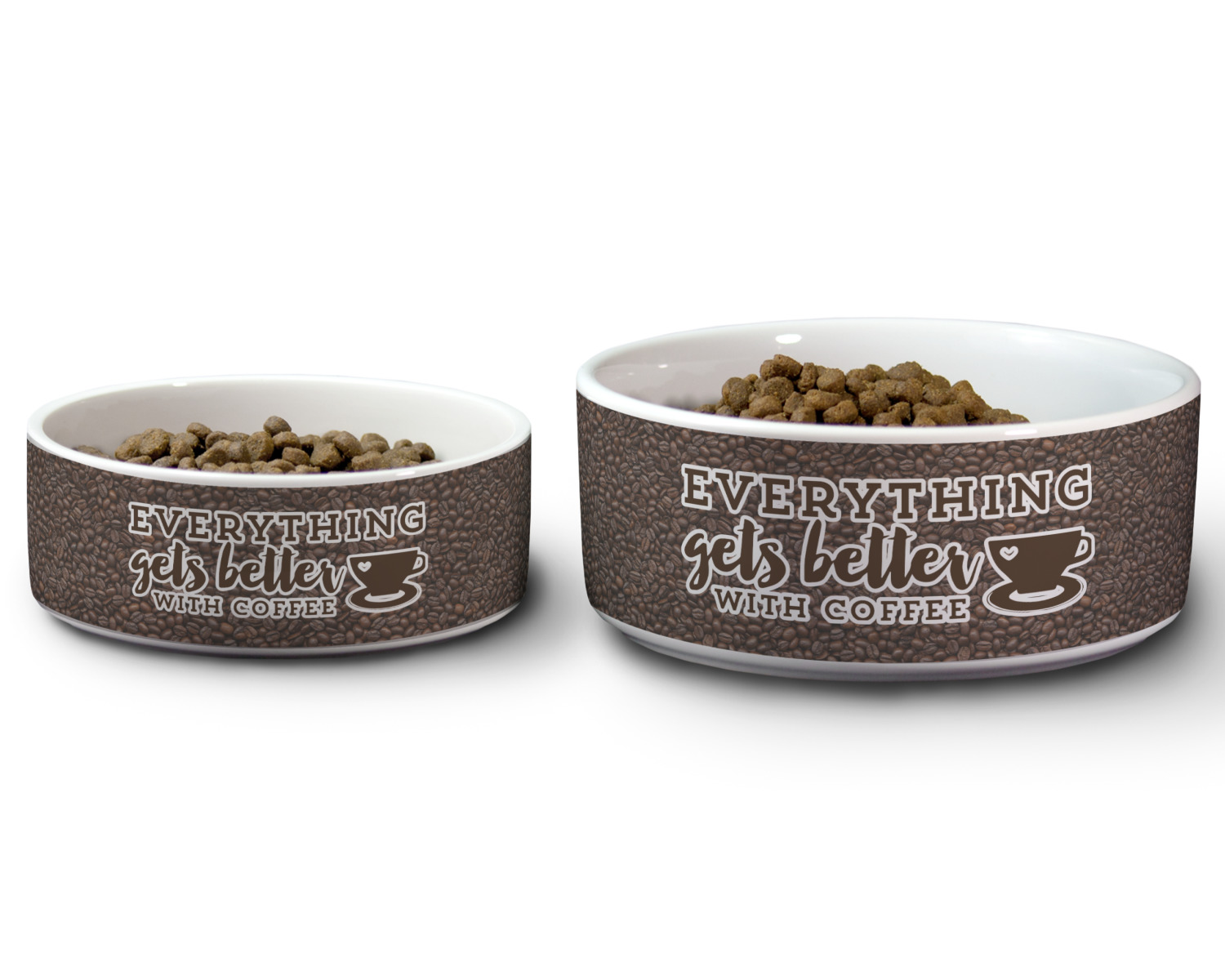 We carry these custom dog bowls in two available sizes: medium and large.The medium is 6 inches in diameter and 2.5 inches tall, and can therefore suit pets who eat up to 2.5 cups of food per meal. The large pet bowl is 7 inches in diameter and 3 inches tall, and suits pets who require up to 4.5 cups of food per meal.