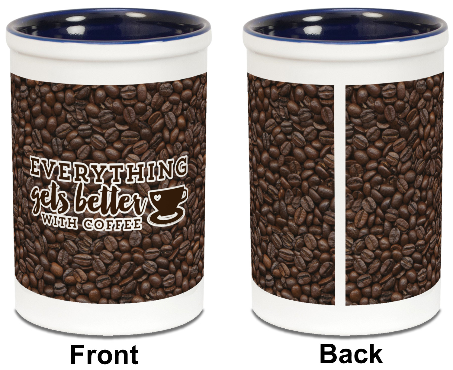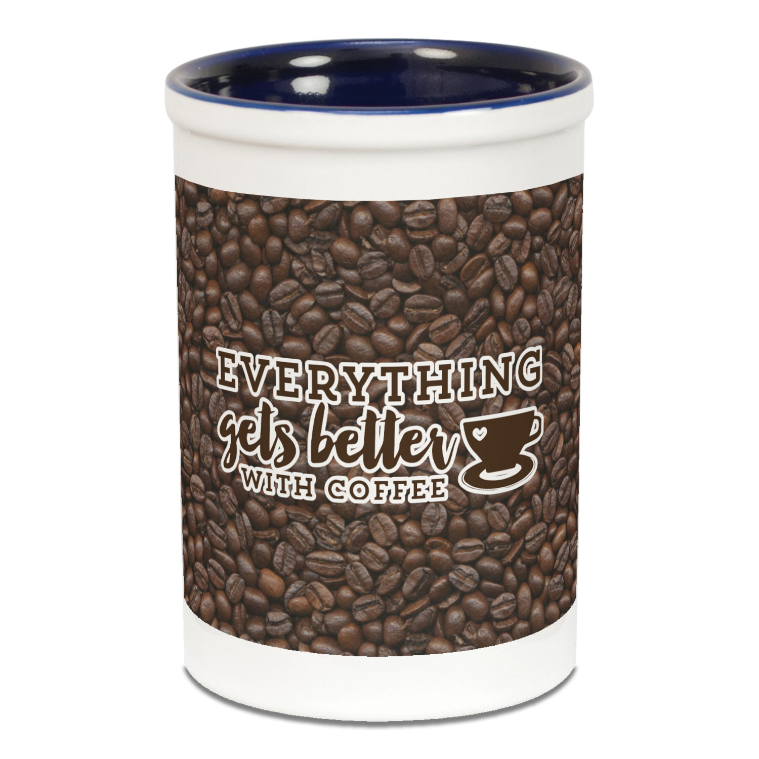 This design has a fun realistic picture of coffee beans for the background. On top of that is a fun quote saying that "everything gets better with coffee." The coordinating design has the words "coffee addict." There are also plenty of other coffee quotes to choose from in our design center.