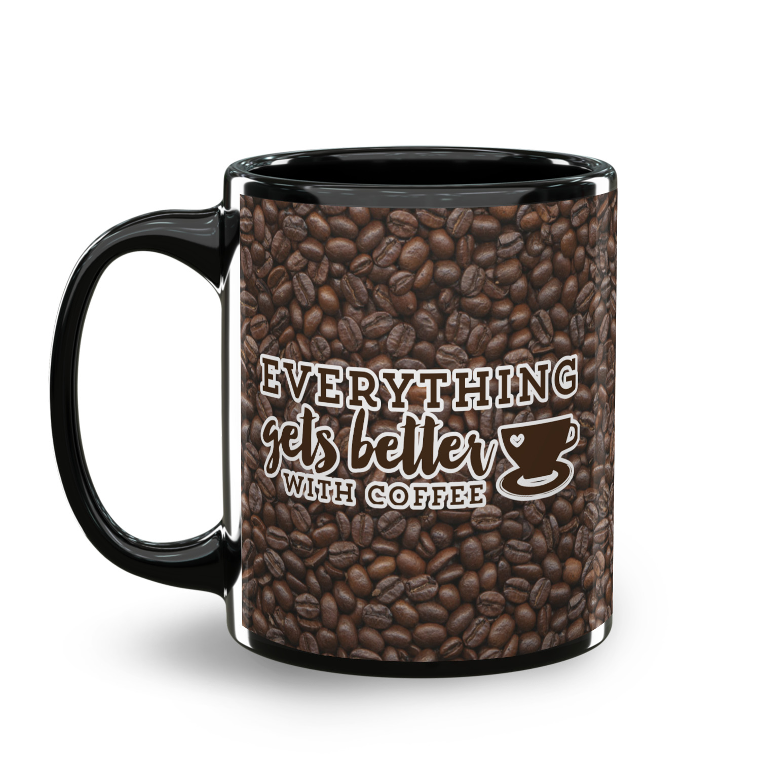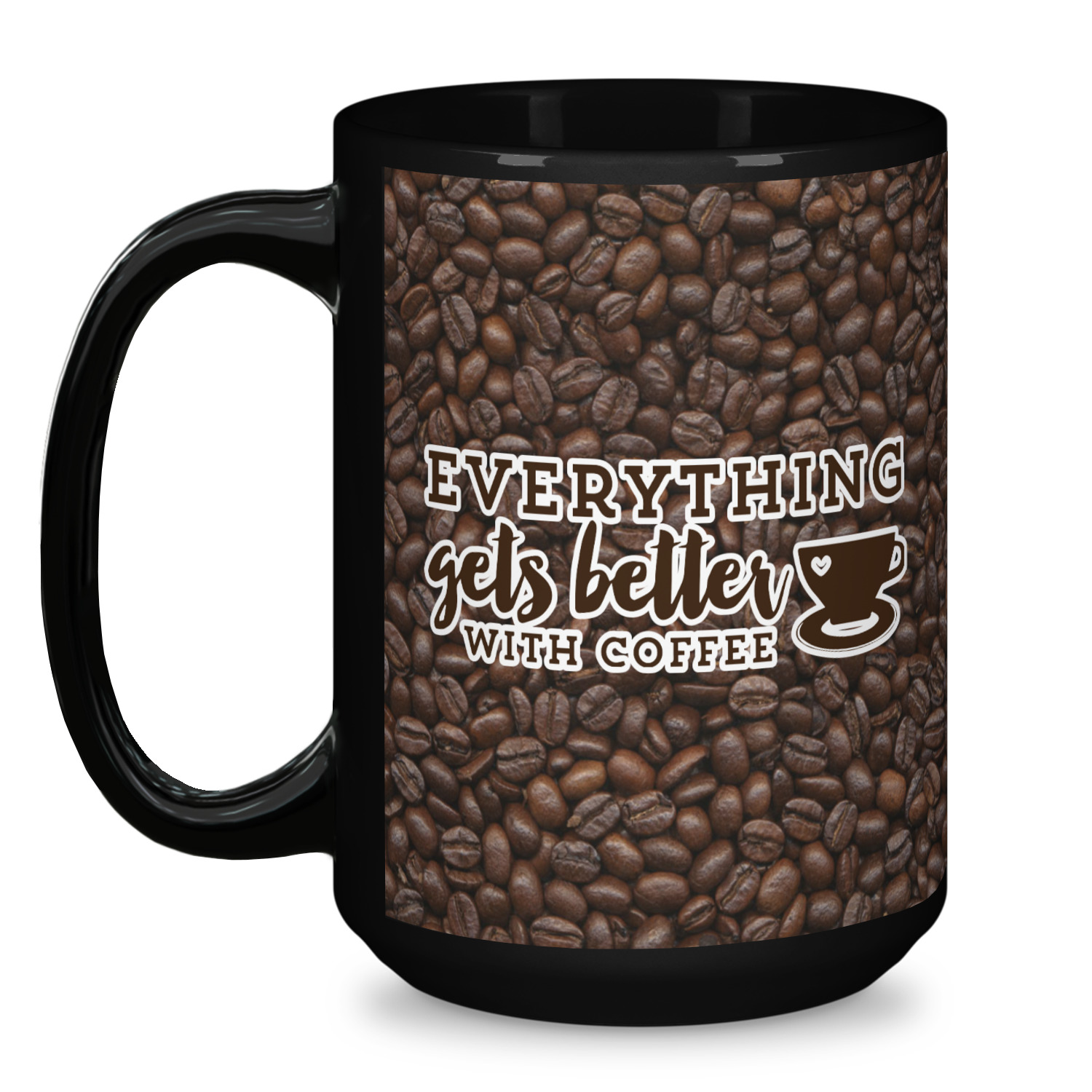 This design has a fun realistic picture of coffee beans for the background. On top of that is a fun quote saying that "everything gets better with coffee." The coordinating design has the words "coffee addict." There are also plenty of other coffee quotes to choose from in our design center.