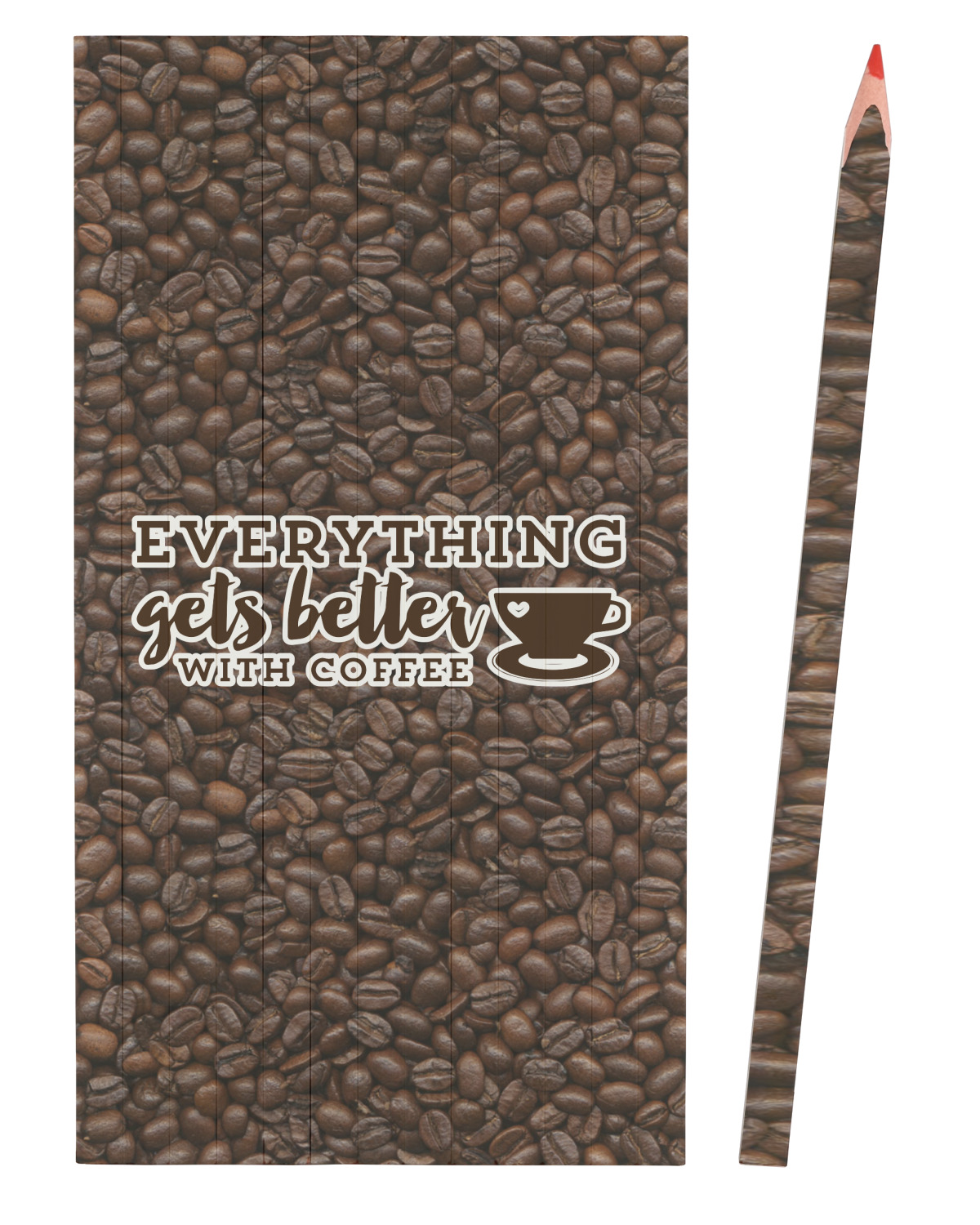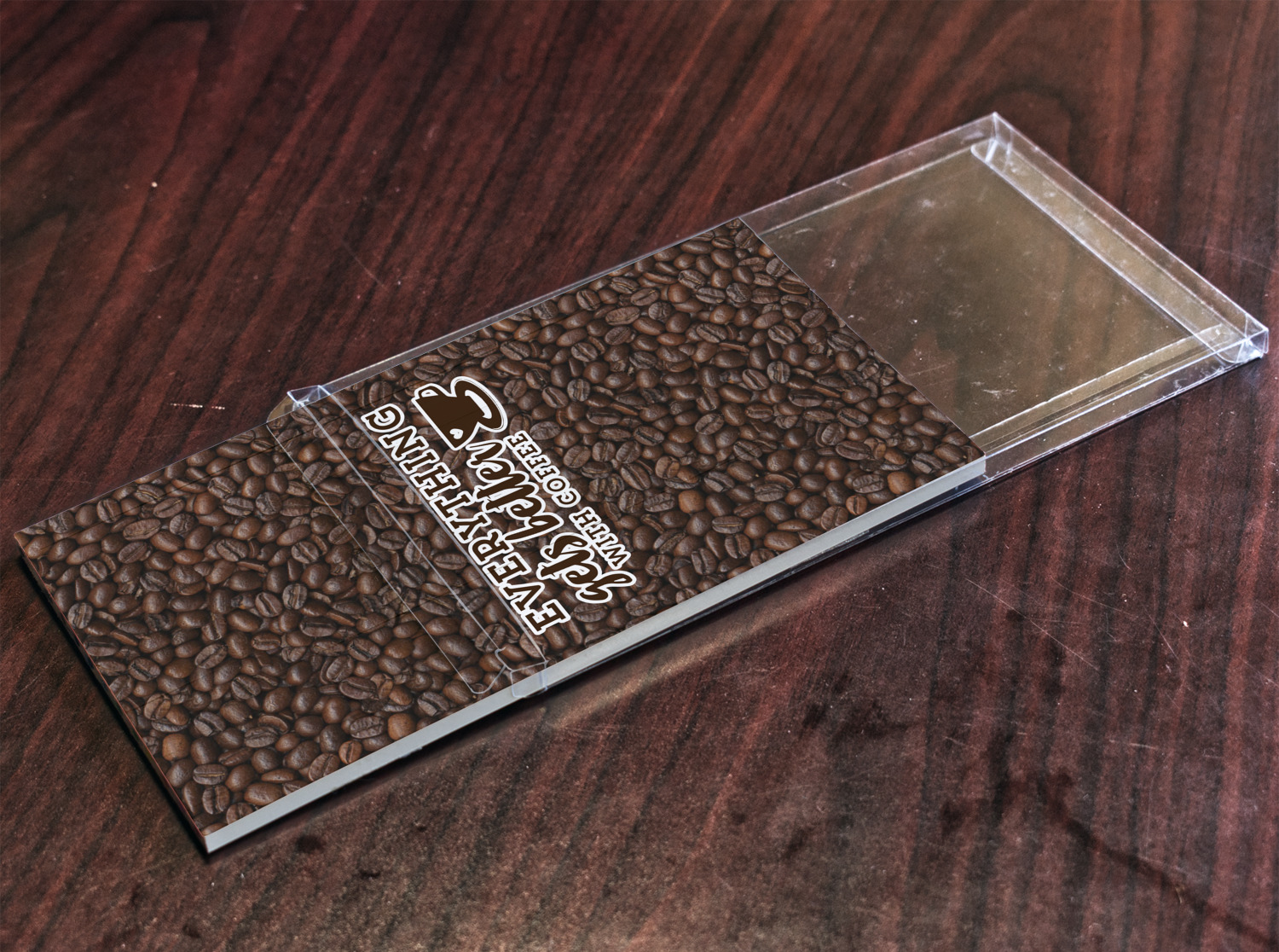 This design has a fun realistic picture of coffee beans for the background. On top of that is a fun quote saying that "everything gets better with coffee." The coordinating design has the words "coffee addict." There are also plenty of other coffee quotes to choose from in our design center.