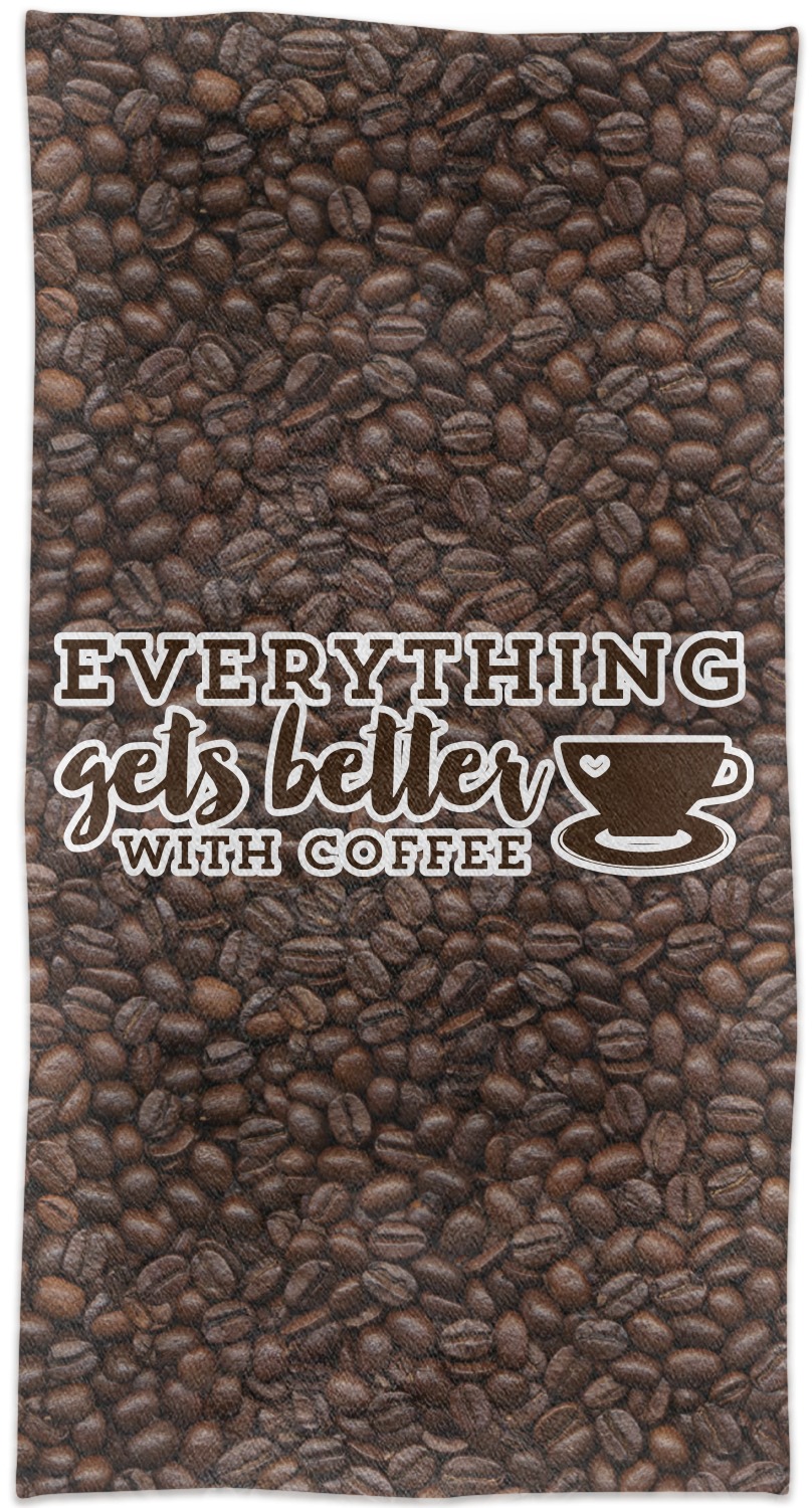 This design has a fun realistic picture of coffee beans for the background. On top of that is a fun quote saying that "everything gets better with coffee." The coordinating design has the words "coffee addict." There are also plenty of other coffee quotes to choose from in our design center.