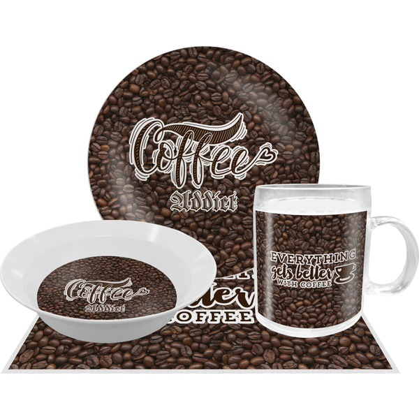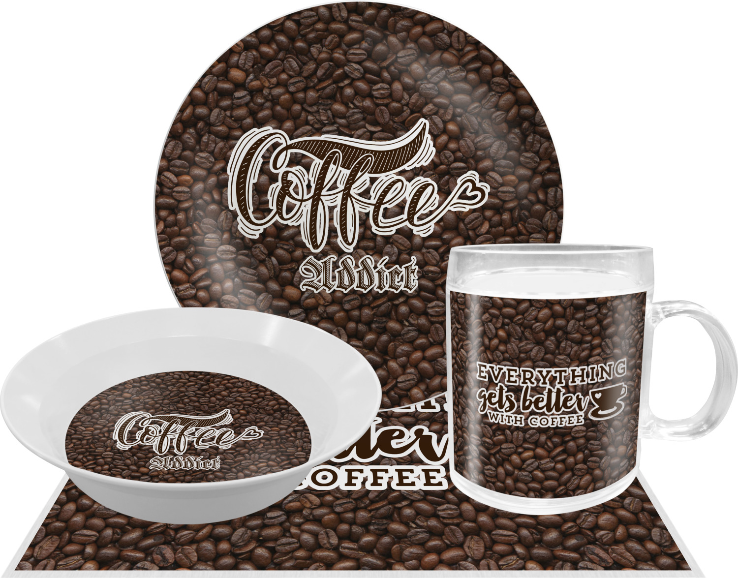 This design has a fun realistic picture of coffee beans for the background. On top of that is a fun quote saying that "everything gets better with coffee." The coordinating design has the words "coffee addict." There are also plenty of other coffee quotes to choose from in our design center.