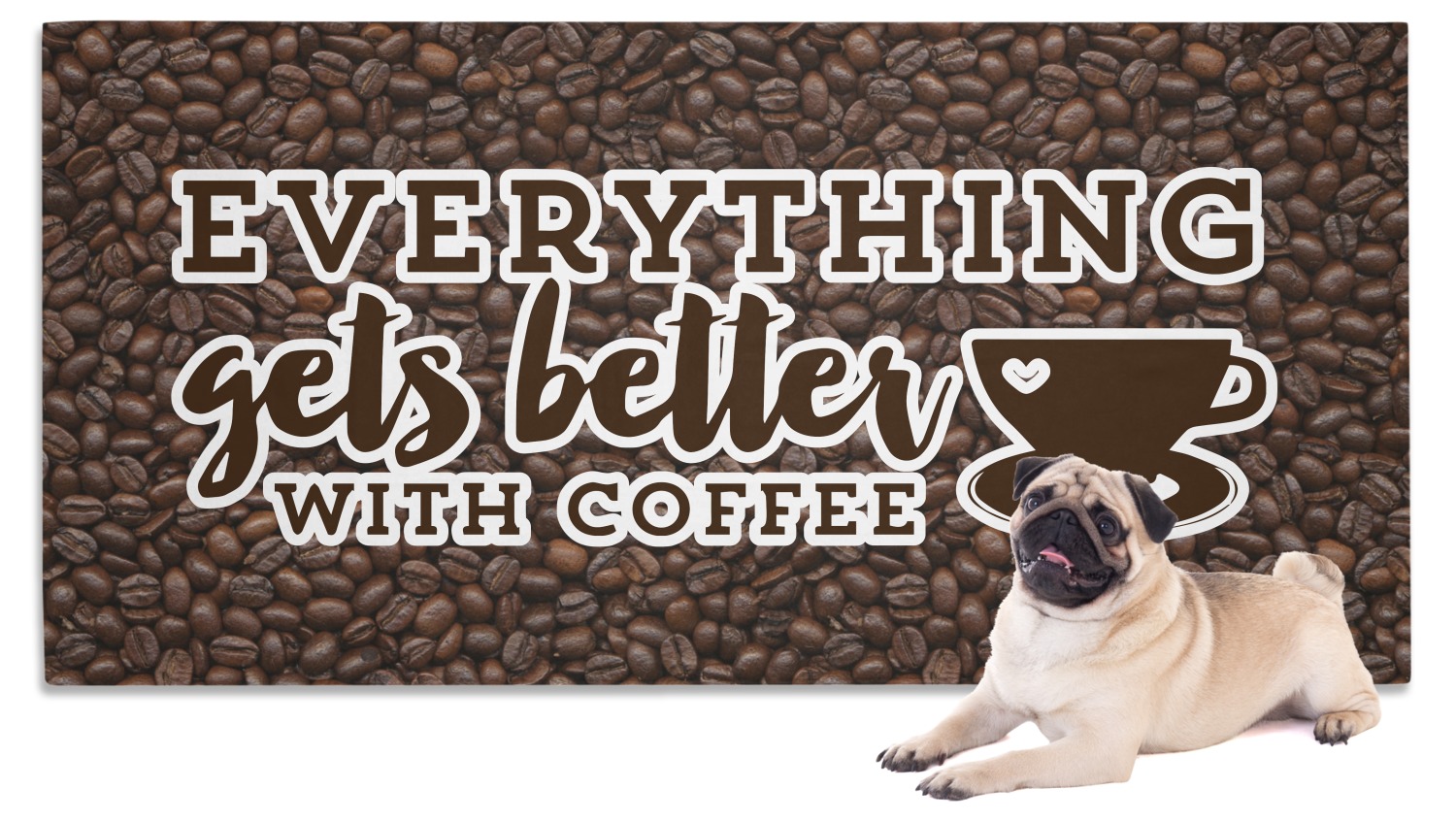 This design has a fun realistic picture of coffee beans for the background. On top of that is a fun quote saying that "everything gets better with coffee." The coordinating design has the words "coffee addict." There are also plenty of other coffee quotes to choose from in our design center.
