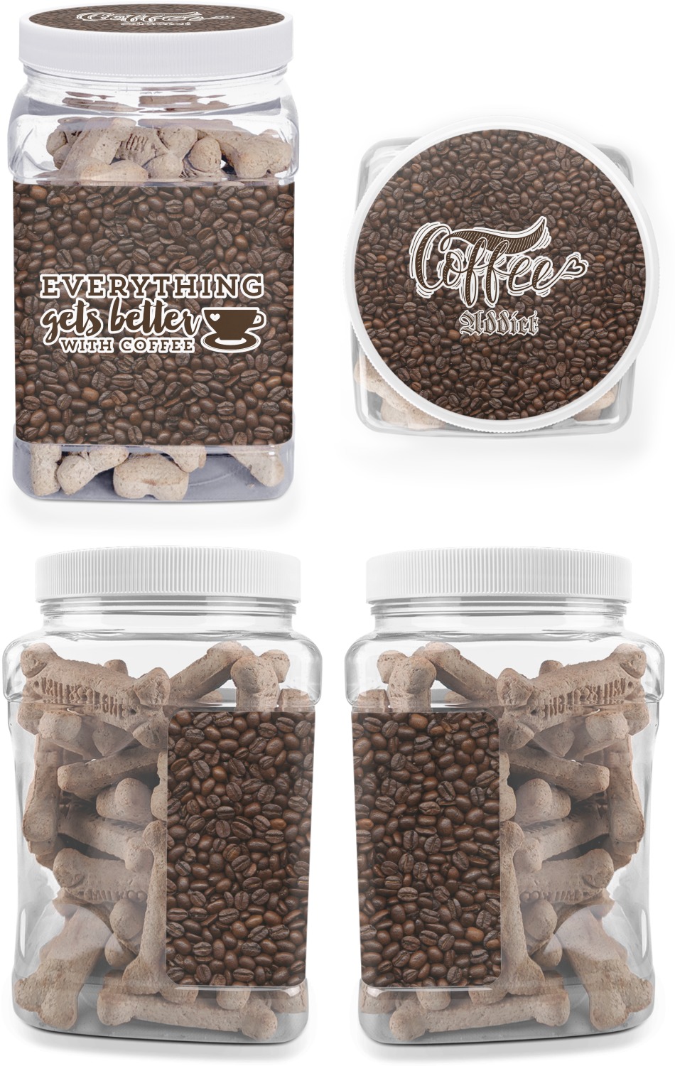 This half gallon jar, made from a sturdy plastic, is the perfect way to keep treats from any naughty pet paws, while still keeping them ready on hand for when your pup performs an impressive trick. This dog cookie jar features a screw-on, white lid that displays your personalized design on a vinyl sticker. We apply another customized sticker that wraps around the front and sides of the jar. Our dog treat jar also has indentations on the rear ends of the sides, which allows for convenient handling, and its square frame allows for easy storage.