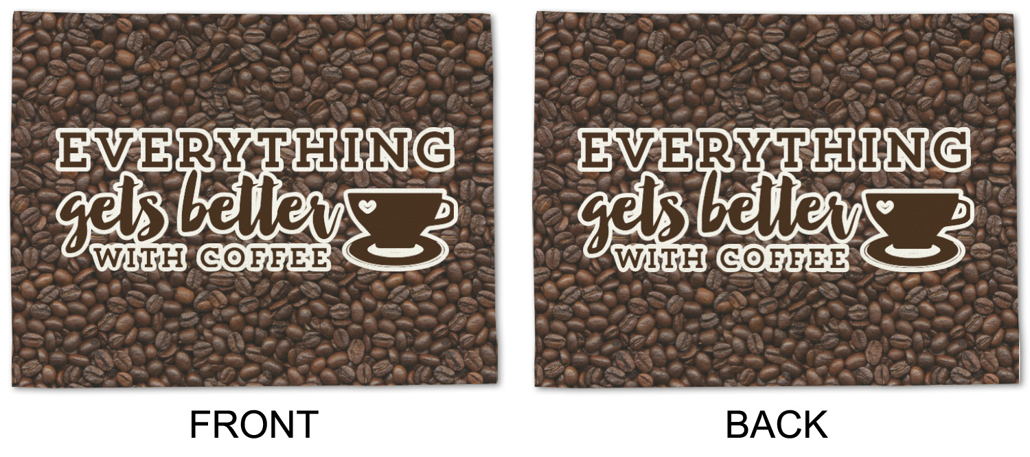 This design has a fun realistic picture of coffee beans for the background. On top of that is a fun quote saying that "everything gets better with coffee." The coordinating design has the words "coffee addict." There are also plenty of other coffee quotes to choose from in our design center.