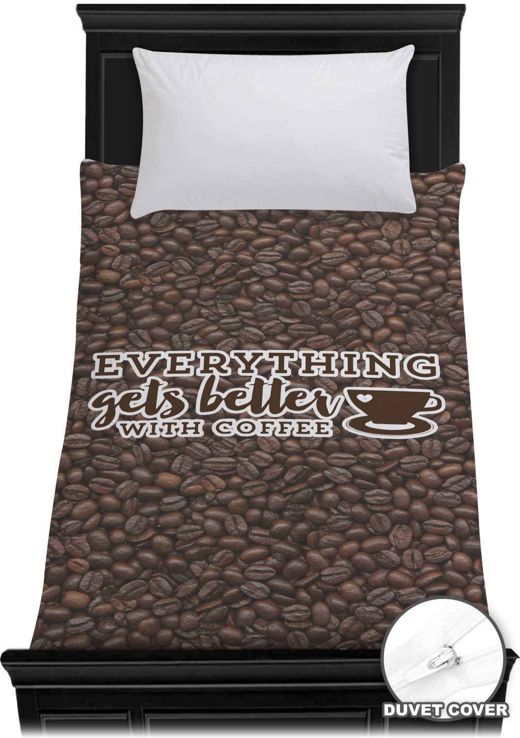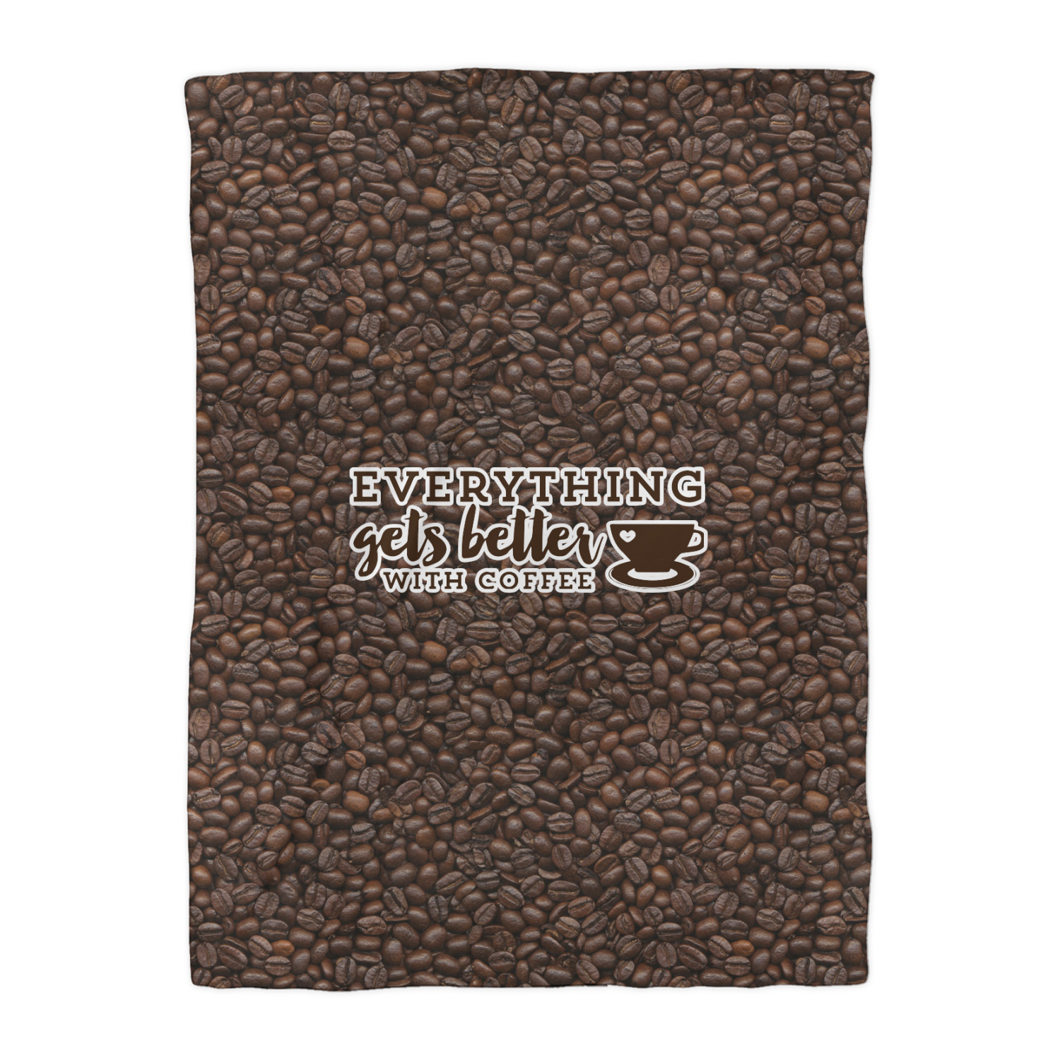 This design has a fun realistic picture of coffee beans for the background. On top of that is a fun quote saying that "everything gets better with coffee." The coordinating design has the words "coffee addict." There are also plenty of other coffee quotes to choose from in our design center.