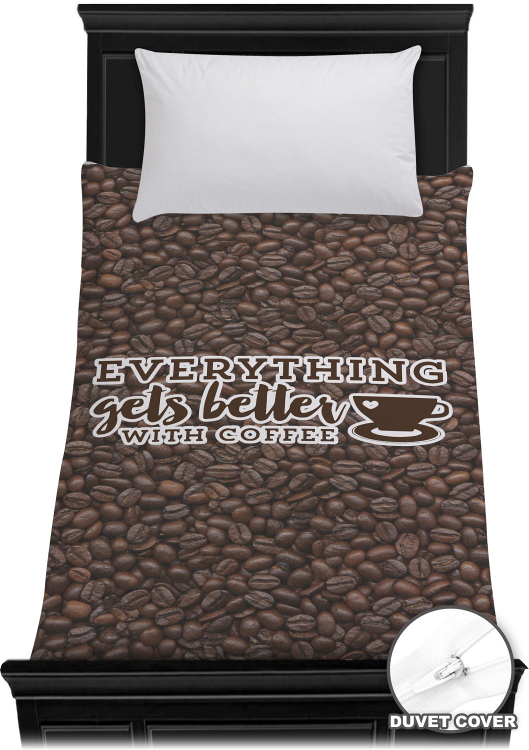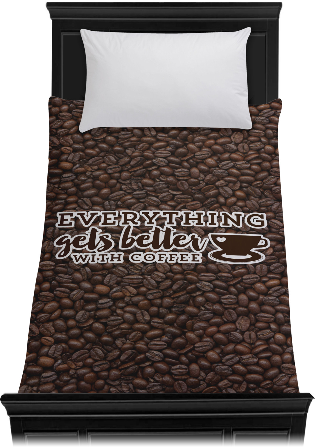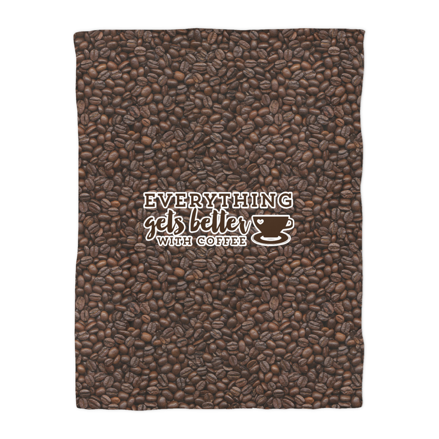 This design has a fun realistic picture of coffee beans for the background. On top of that is a fun quote saying that "everything gets better with coffee." The coordinating design has the words "coffee addict." There are also plenty of other coffee quotes to choose from in our design center.