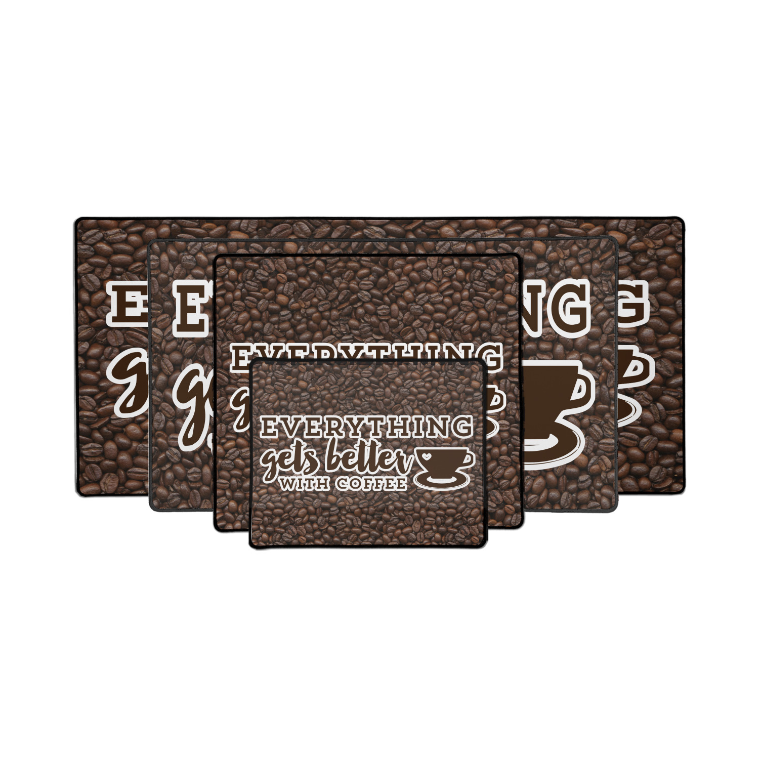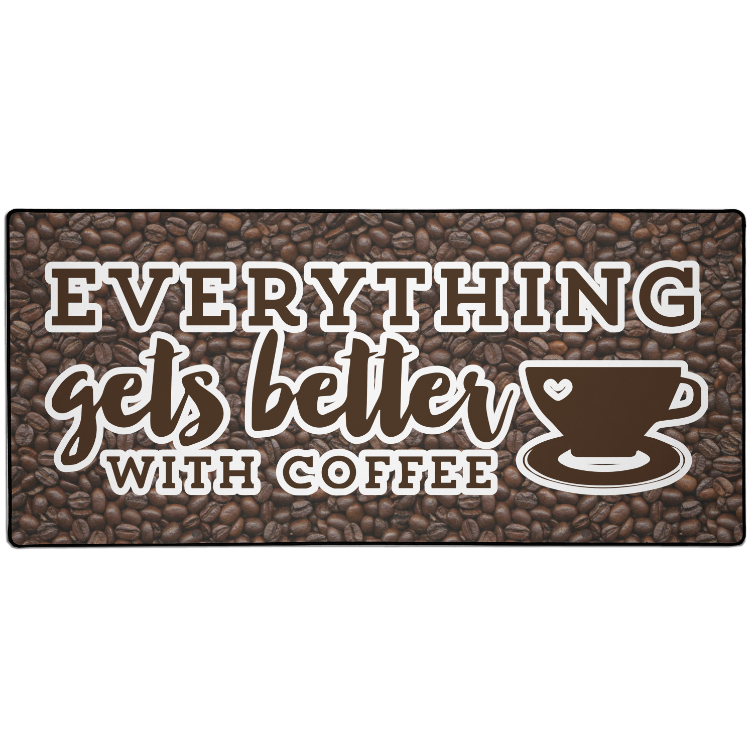 This design has a fun realistic picture of coffee beans for the background. On top of that is a fun quote saying that "everything gets better with coffee." The coordinating design has the words "coffee addict." There are also plenty of other coffee quotes to choose from in our design center.