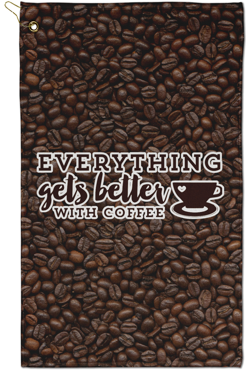 This design has a fun realistic picture of coffee beans for the background. On top of that is a fun quote saying that "everything gets better with coffee." The coordinating design has the words "coffee addict." There are also plenty of other coffee quotes to choose from in our design center.