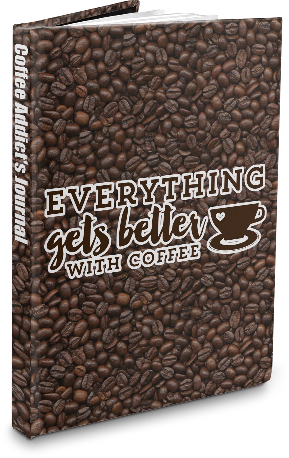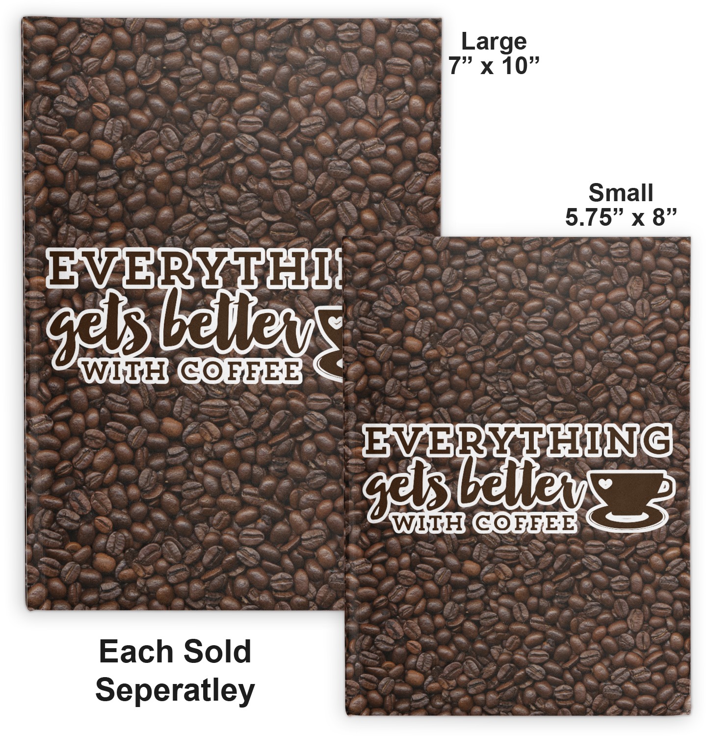 This design has a fun realistic picture of coffee beans for the background. On top of that is a fun quote saying that "everything gets better with coffee." The coordinating design has the words "coffee addict." There are also plenty of other coffee quotes to choose from in our design center.