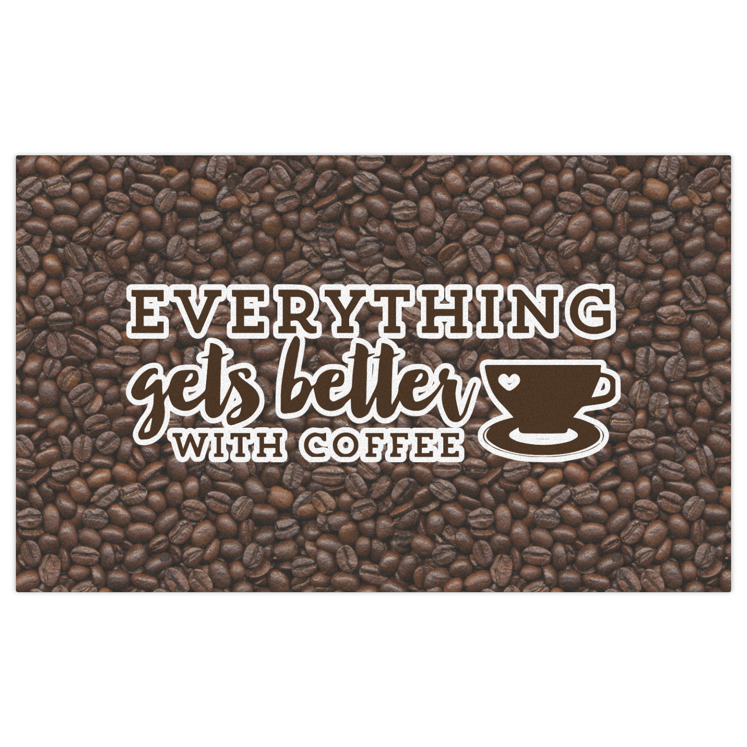This design has a fun realistic picture of coffee beans for the background. On top of that is a fun quote saying that "everything gets better with coffee." The coordinating design has the words "coffee addict." There are also plenty of other coffee quotes to choose from in our design center.