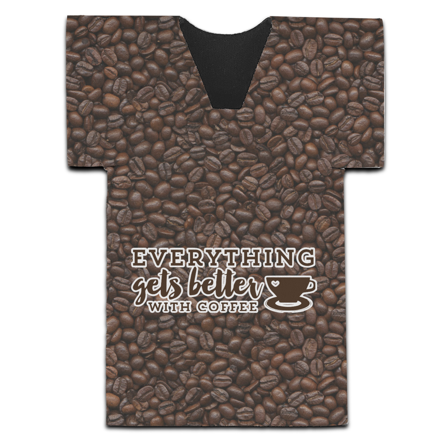 This design has a fun realistic picture of coffee beans for the background. On top of that is a fun quote saying that "everything gets better with coffee." The coordinating design has the words "coffee addict." There are also plenty of other coffee quotes to choose from in our design center.