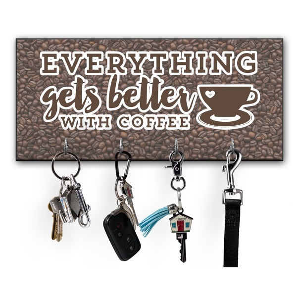 This 11" x 5" key hanger is made of sturdy wood and has four metal hooks lining the bottom. This is the perfect size for a family with several drivers. Not only can you hang keys on it though, but pet leashes and other small items. The board is black on the sides and back and is printed with the design of your choice on the front.