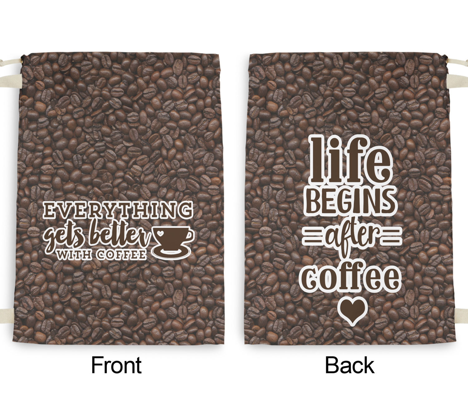 This design has a fun realistic picture of coffee beans for the background. On top of that is a fun quote saying that "everything gets better with coffee." The coordinating design has the words "coffee addict." There are also plenty of other coffee quotes to choose from in our design center.