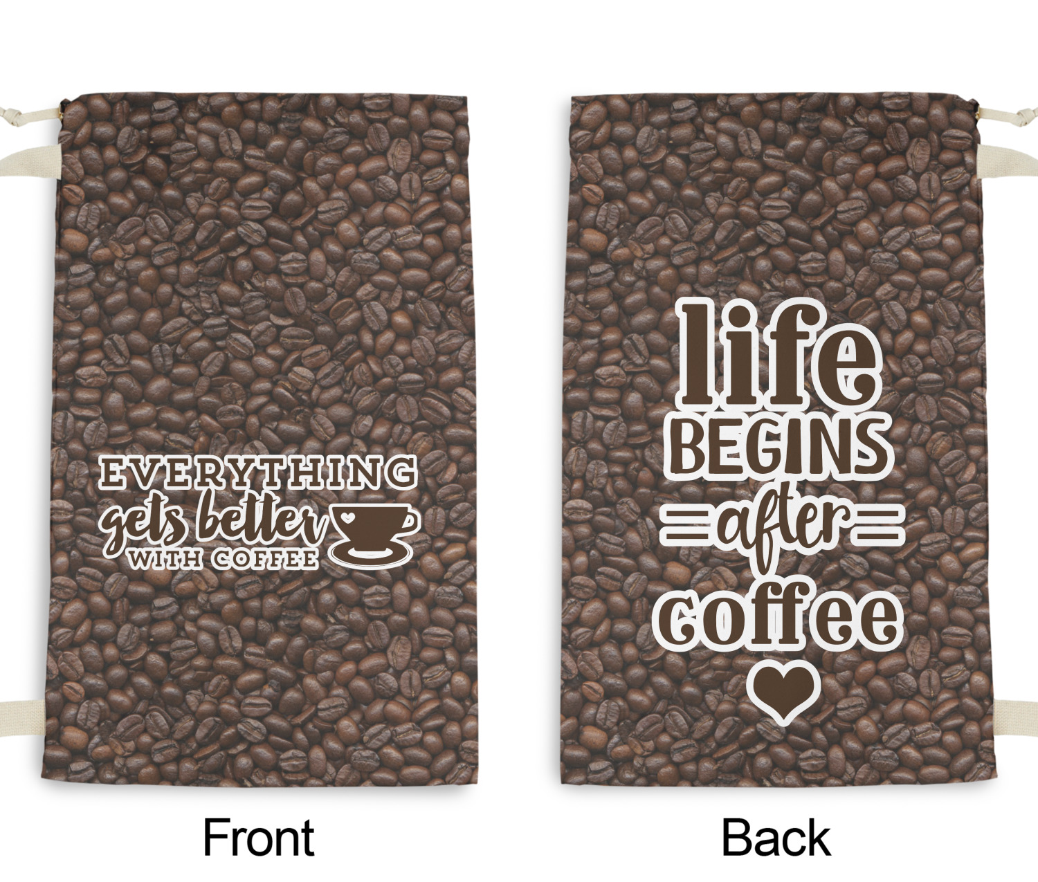 This design has a fun realistic picture of coffee beans for the background. On top of that is a fun quote saying that "everything gets better with coffee." The coordinating design has the words "coffee addict." There are also plenty of other coffee quotes to choose from in our design center.