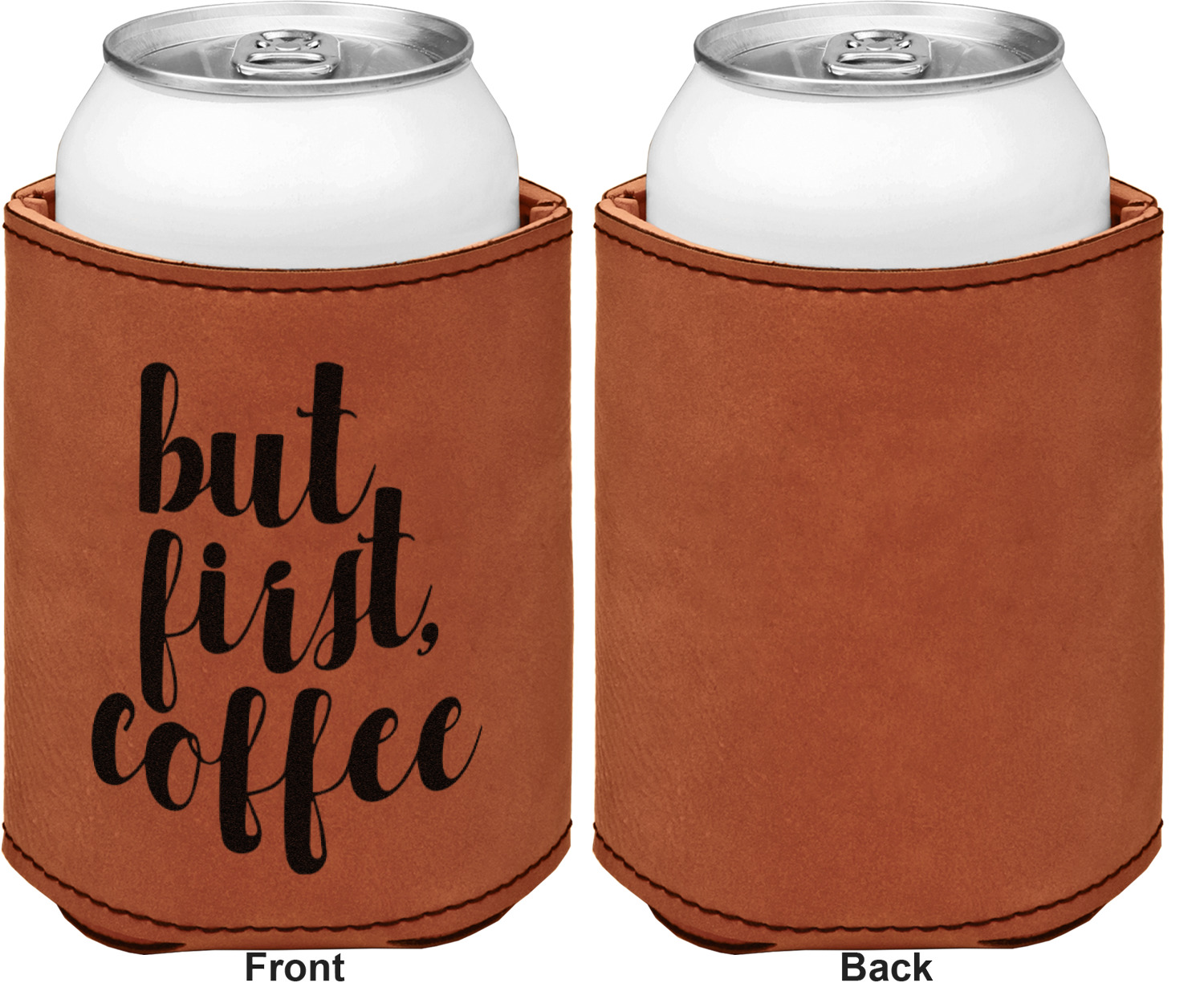 This can sleeve is made from a cognac-brown leatherette and stitched with a sturdy, black thread. A slim padding lines the inside of your can sleeve to allow for a better fit once your drink is inserted. The sleeve itself measures at 4 by 4.5 inches, allowing this custom can sleeve to accommodate most canned drinks. Your personalized design can be engraved on the front and back, or solely the front. When laser-engraved, your design appears as a black coloration which contrasts the leatherette nicely.