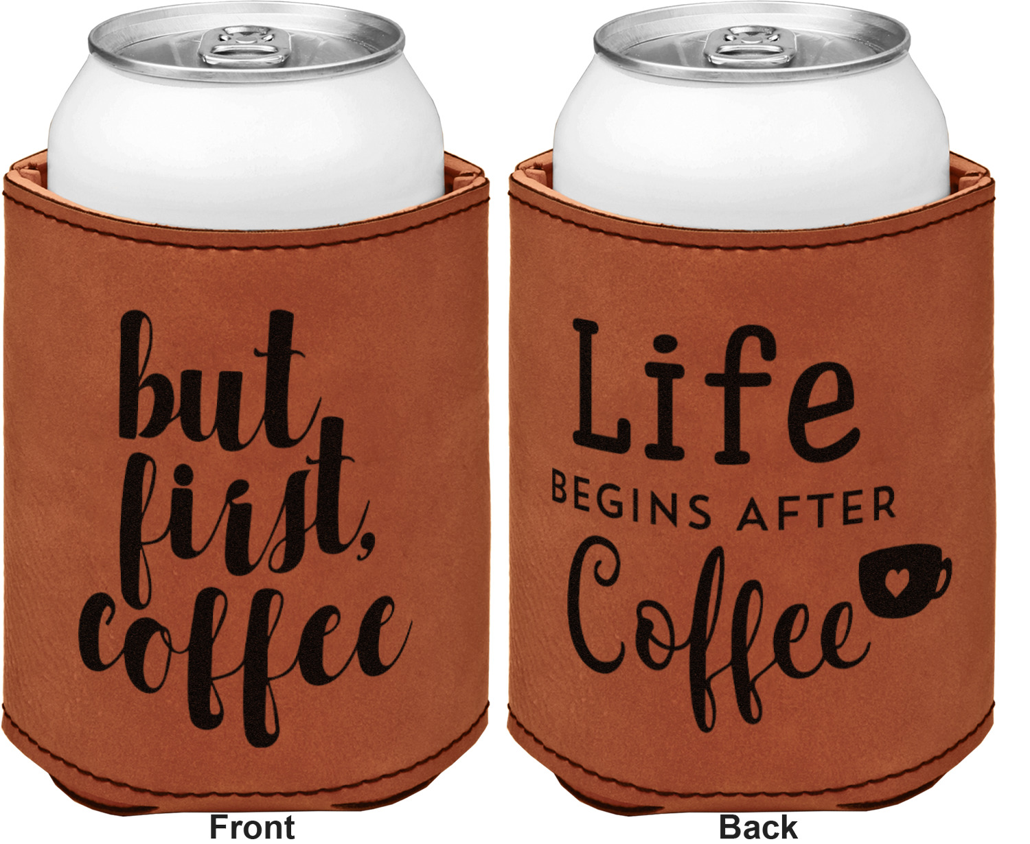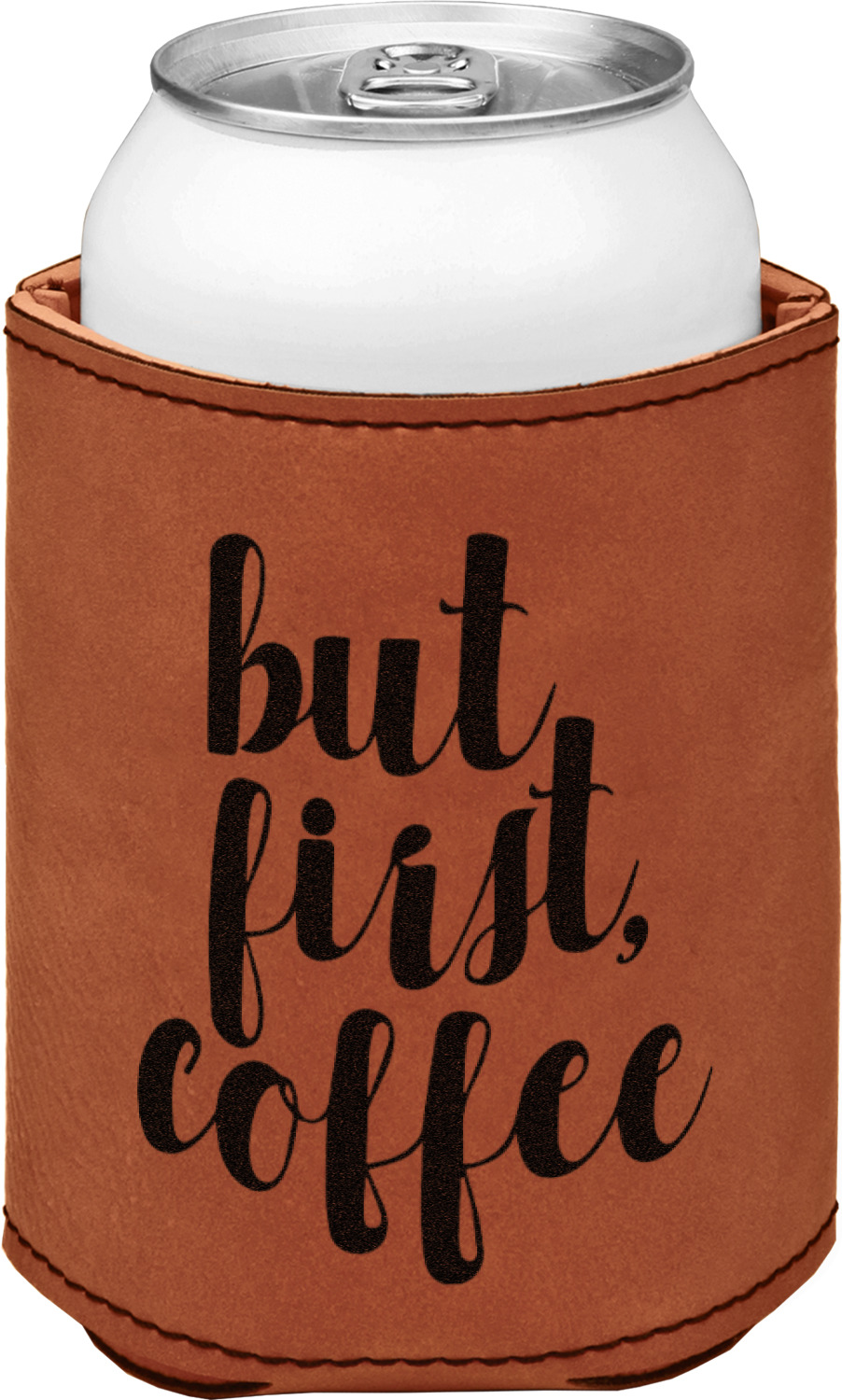 This can sleeve is made from a cognac-brown leatherette and stitched with a sturdy, black thread. A slim padding lines the inside of your can sleeve to allow for a better fit once your drink is inserted. The sleeve itself measures at 4 by 4.5 inches, allowing this custom can sleeve to accommodate most canned drinks. Your personalized design can be engraved on the front and back, or solely the front. When laser-engraved, your design appears as a black coloration which contrasts the leatherette nicely.