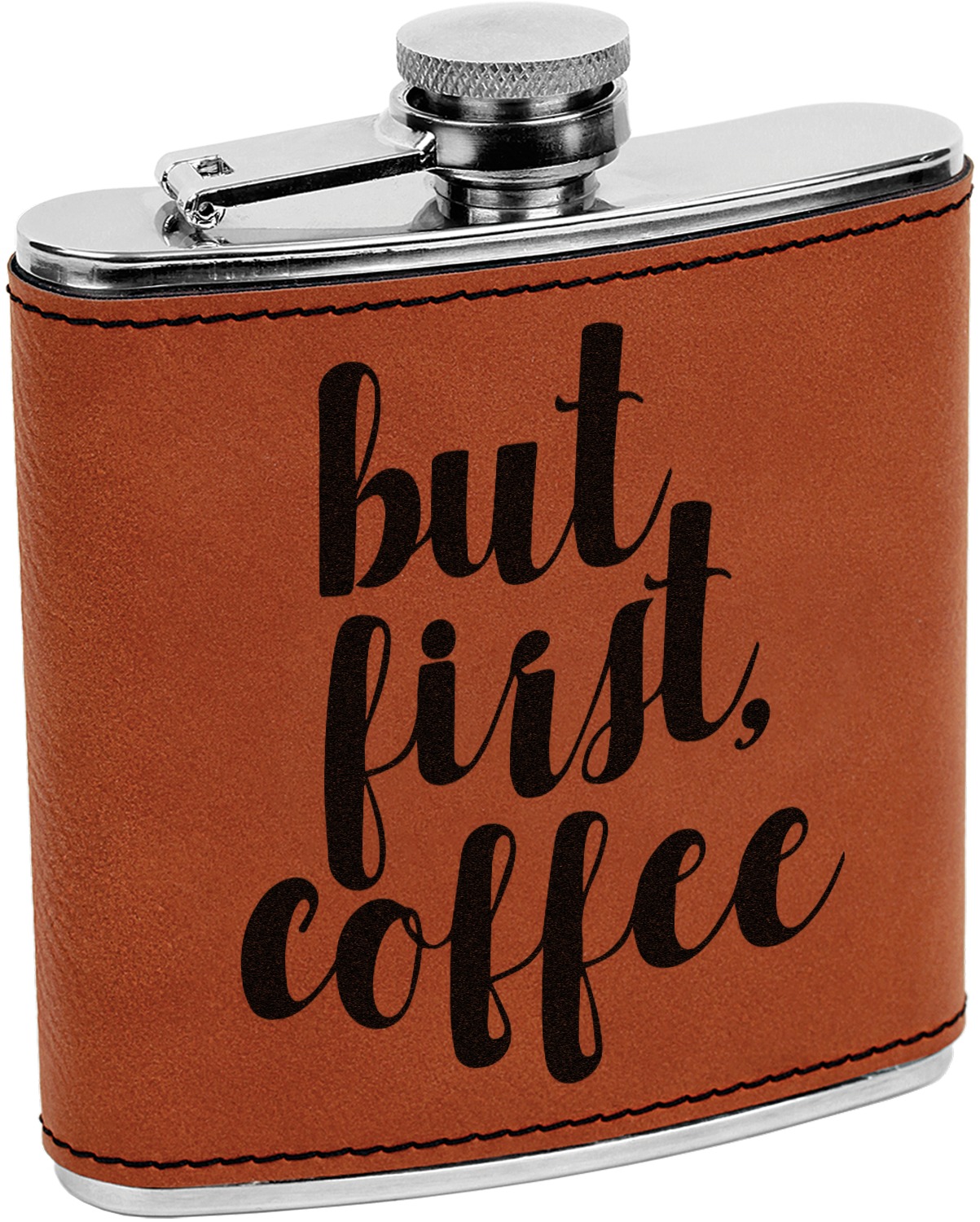 This custom flask is built from stainless steel, can hold 6 ounces, and is wrapped in a cognac-brown leatherette sleeve. The leatherette supplies a good grip on the liquor flask, while the slight curvature of the flask itself allows for a snug fit in your hand. Fine, black stitching lines the edges of the leatherette, adding to the durability of the material. This personalized flask features the traditional, screw and flip lid at its top, which prevents any unwanted spillage. Your customized design is precisely laser-engraved into the leatherette, leaving an elegant, dark-brown, almost black coloration.