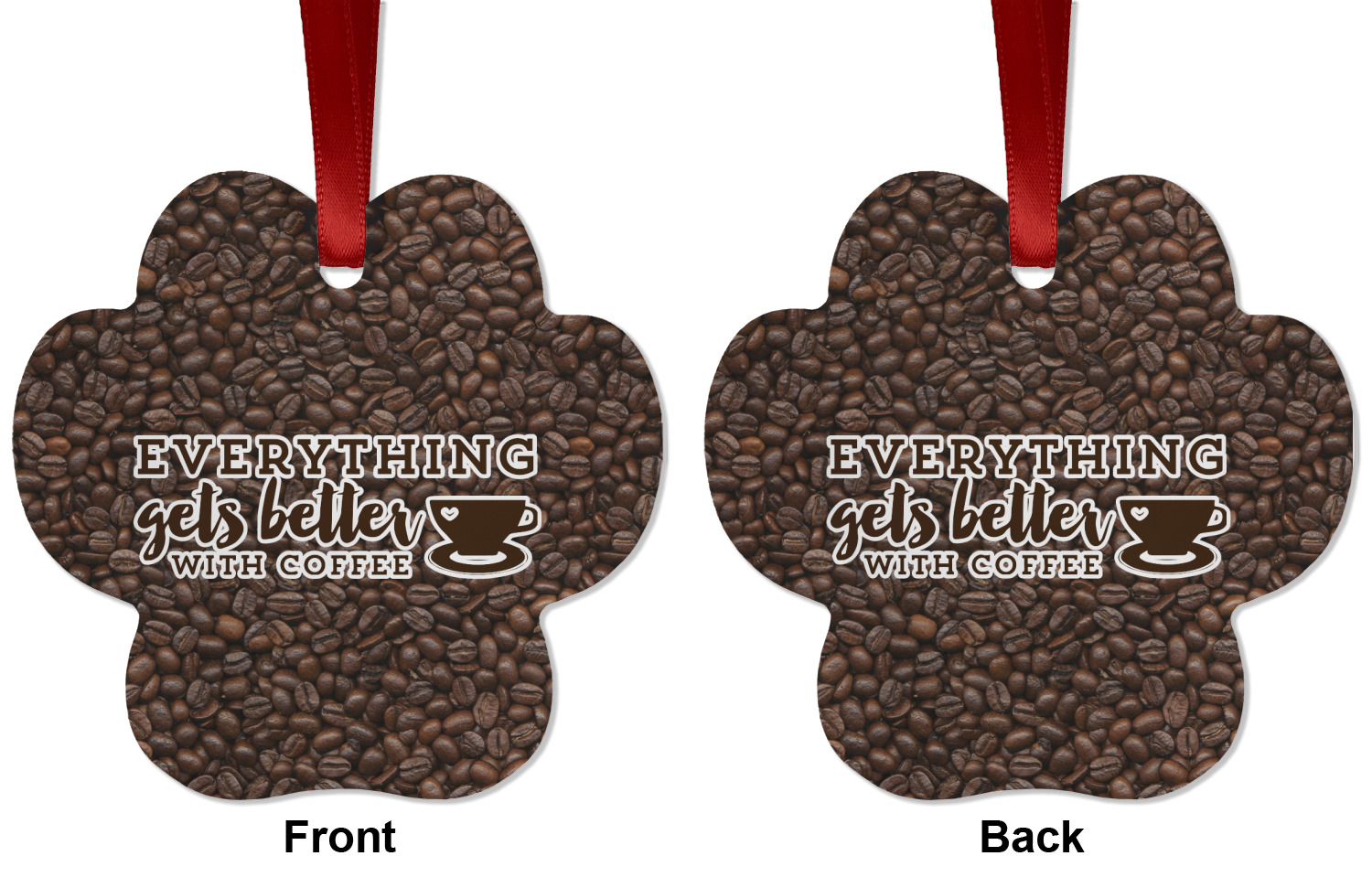 This design has a fun realistic picture of coffee beans for the background. On top of that is a fun quote saying that "everything gets better with coffee." The coordinating design has the words "coffee addict." There are also plenty of other coffee quotes to choose from in our design center.