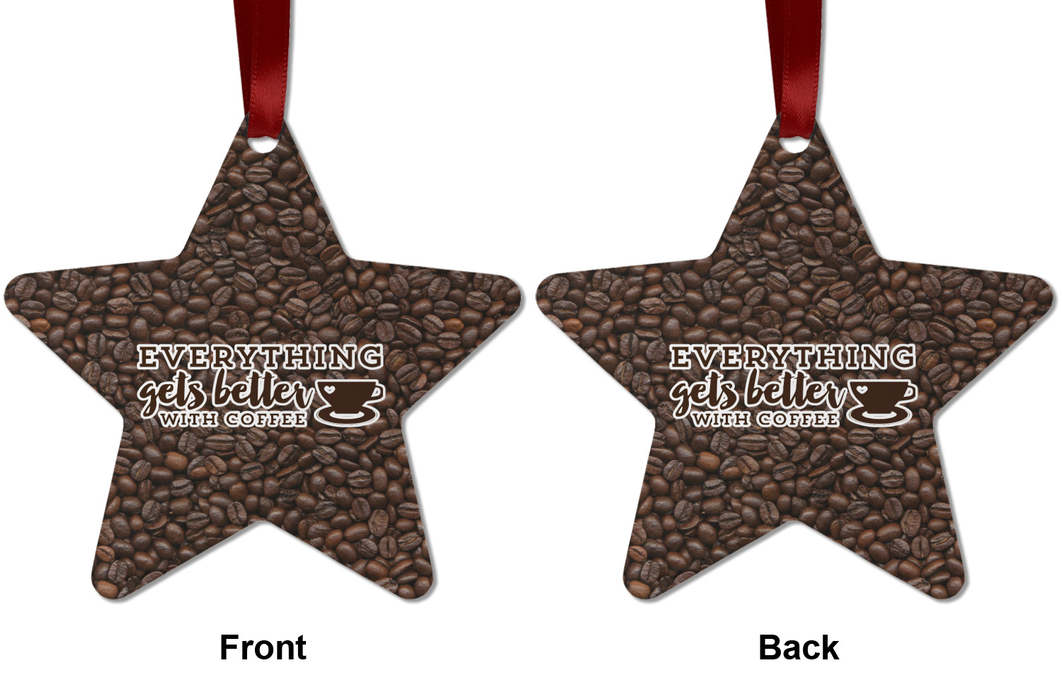 This design has a fun realistic picture of coffee beans for the background. On top of that is a fun quote saying that "everything gets better with coffee." The coordinating design has the words "coffee addict." There are also plenty of other coffee quotes to choose from in our design center.