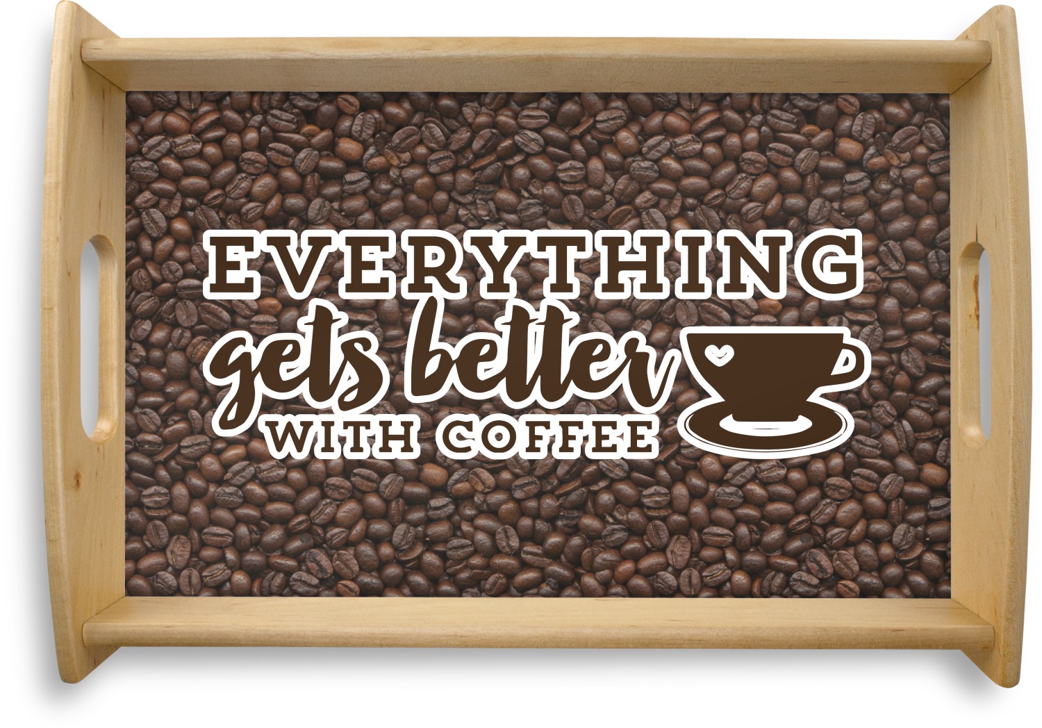 This design has a fun realistic picture of coffee beans for the background. On top of that is a fun quote saying that "everything gets better with coffee." The coordinating design has the words "coffee addict." There are also plenty of other coffee quotes to choose from in our design center.
