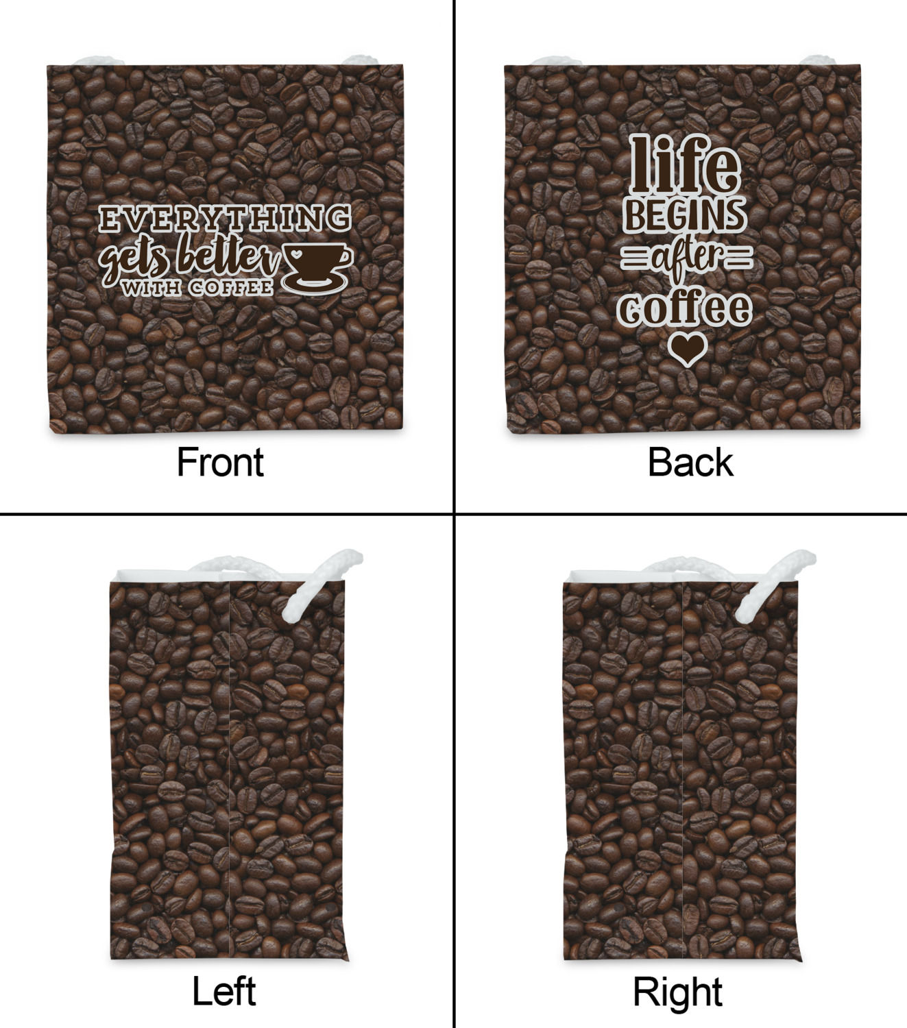 This design has a fun realistic picture of coffee beans for the background. On top of that is a fun quote saying that "everything gets better with coffee." The coordinating design has the words "coffee addict." There are also plenty of other coffee quotes to choose from in our design center.