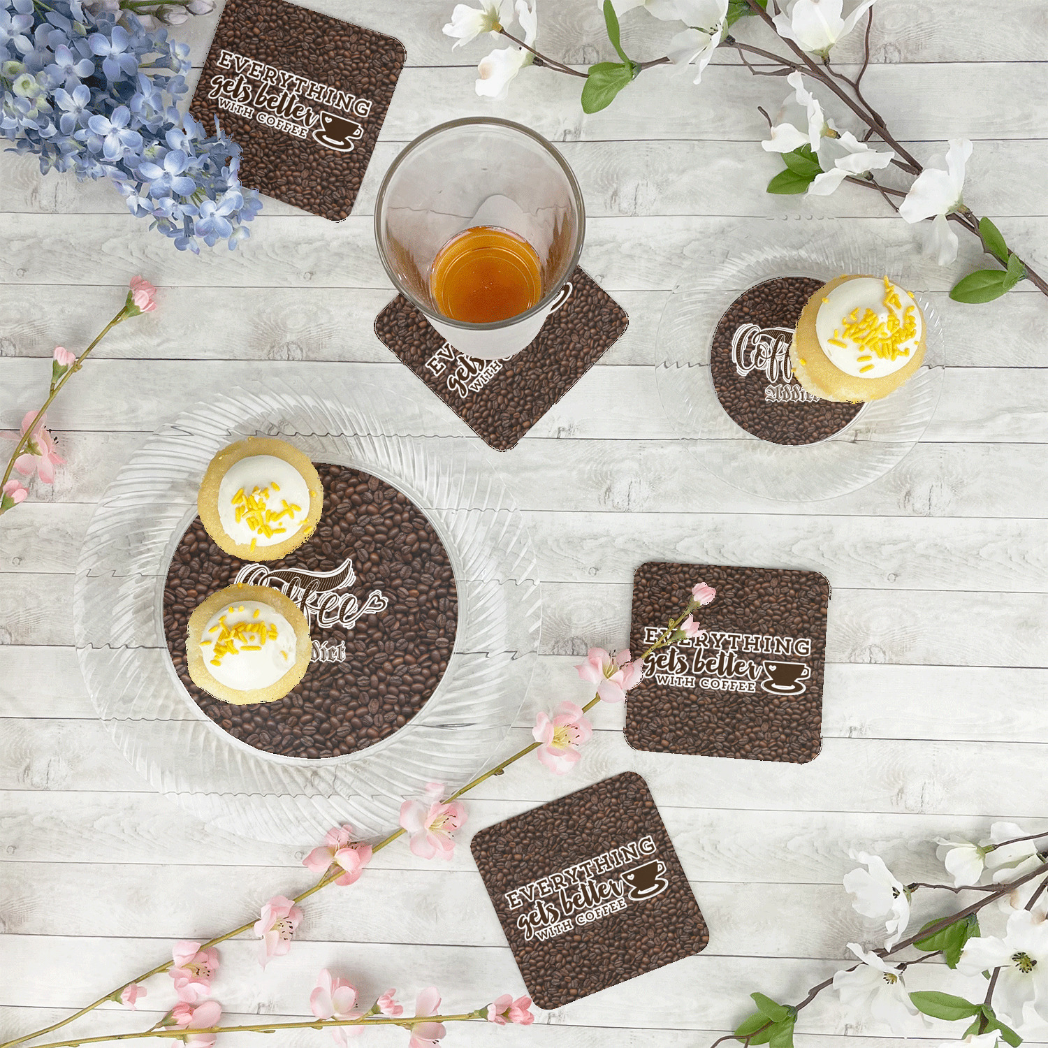 This design has a fun realistic picture of coffee beans for the background. On top of that is a fun quote saying that "everything gets better with coffee." The coordinating design has the words "coffee addict." There are also plenty of other coffee quotes to choose from in our design center.
