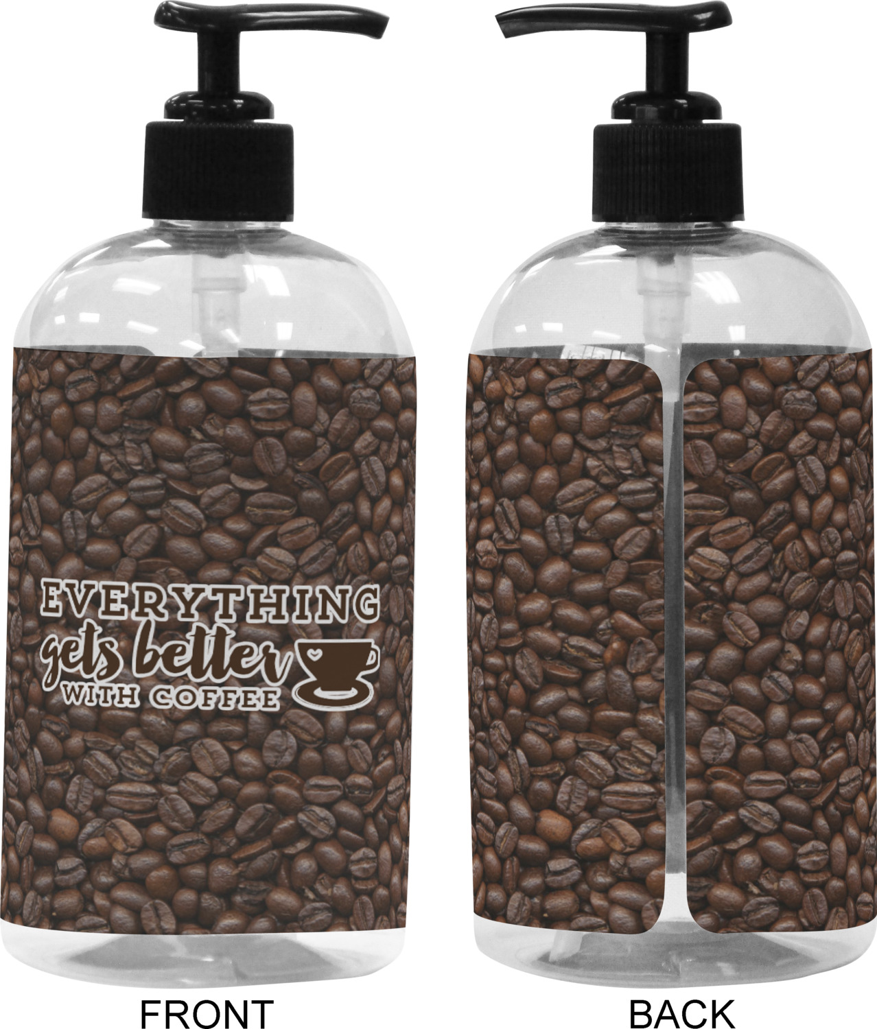 This design has a fun realistic picture of coffee beans for the background. On top of that is a fun quote saying that "everything gets better with coffee." The coordinating design has the words "coffee addict." There are also plenty of other coffee quotes to choose from in our design center.