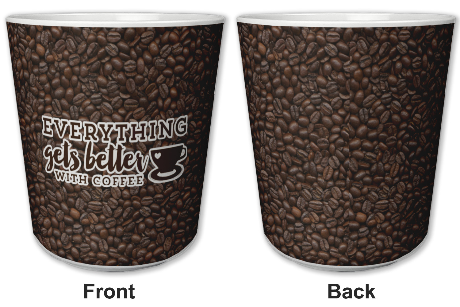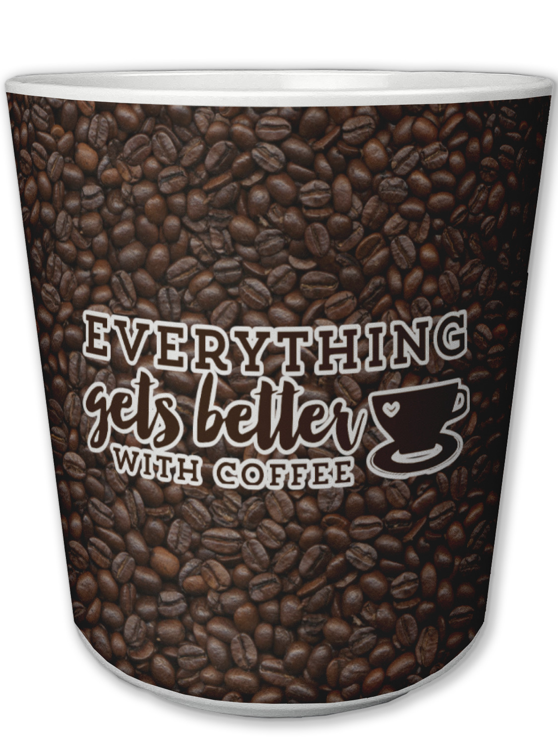 This design has a fun realistic picture of coffee beans for the background. On top of that is a fun quote saying that "everything gets better with coffee." The coordinating design has the words "coffee addict." There are also plenty of other coffee quotes to choose from in our design center.