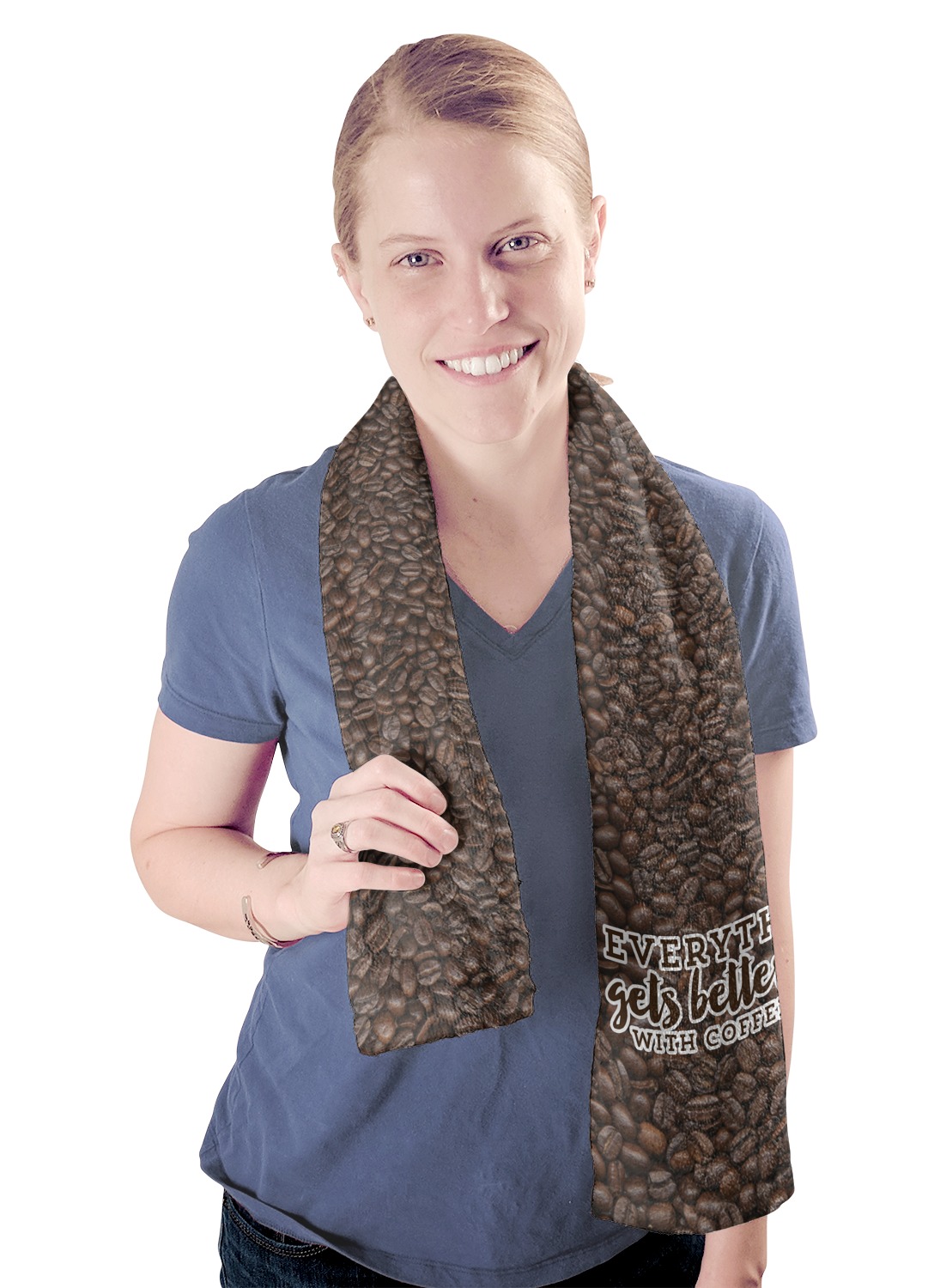 This design has a fun realistic picture of coffee beans for the background. On top of that is a fun quote saying that "everything gets better with coffee." The coordinating design has the words "coffee addict." There are also plenty of other coffee quotes to choose from in our design center.