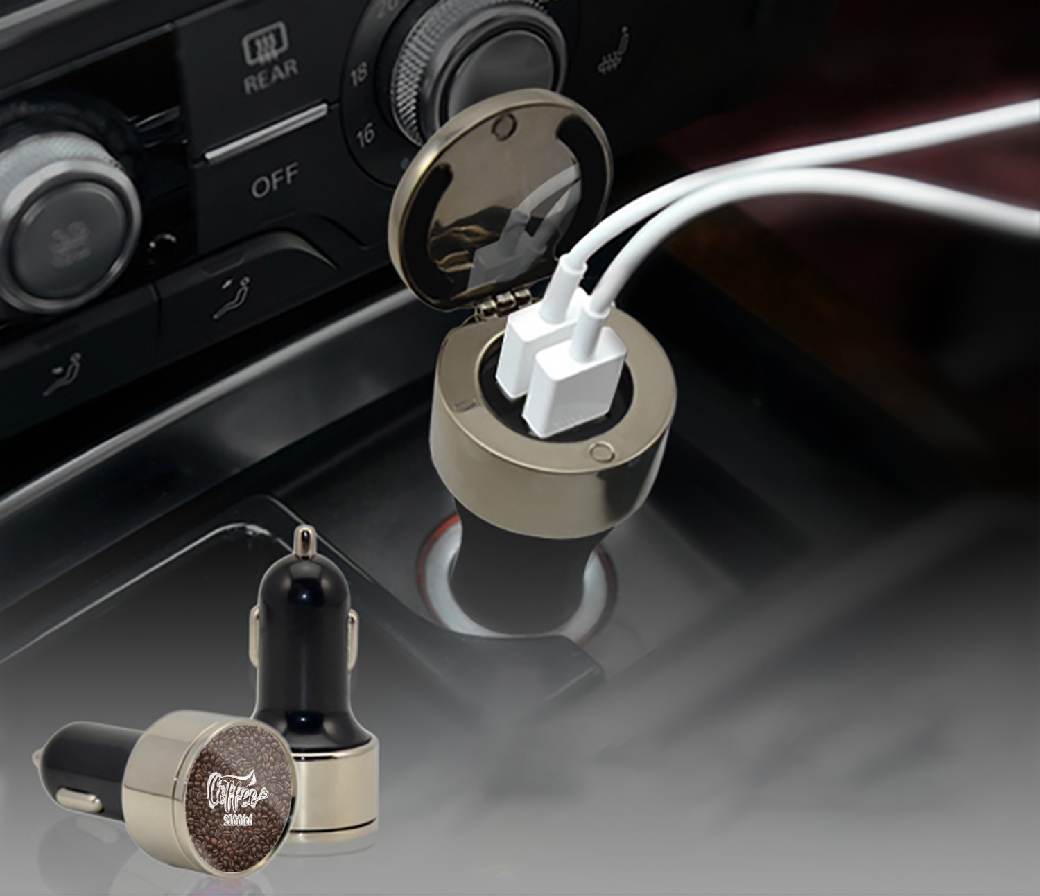 This car charger adapter converts your cars bland cigarette lighter into a decorative, personalized, and operational USB charging port. Made of solid, silver-plated metal, these chargers feature a flip-open lid that both displays your customized design and conceals two USB ports. The metal lid of the USB car charger adapter is 1.5" in diameter and seals due to a small, ingrained magnet on both the charger and its lid. The cigarette lighter insert, itself, is colored black.