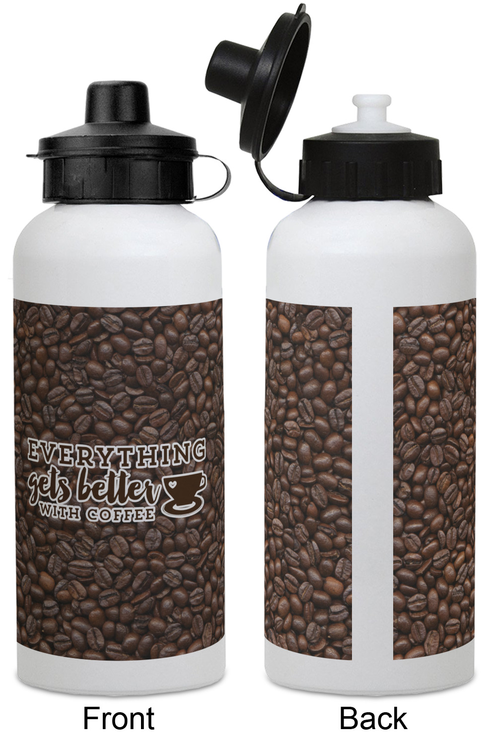 This design has a fun realistic picture of coffee beans for the background. On top of that is a fun quote saying that "everything gets better with coffee." The coordinating design has the words "coffee addict." There are also plenty of other coffee quotes to choose from in our design center.