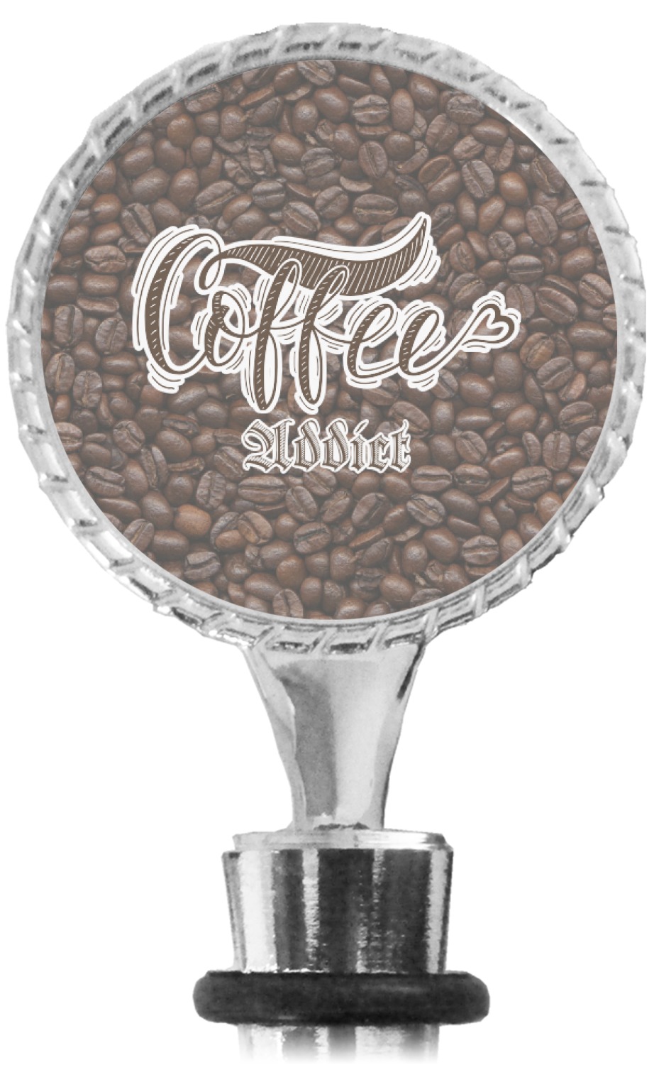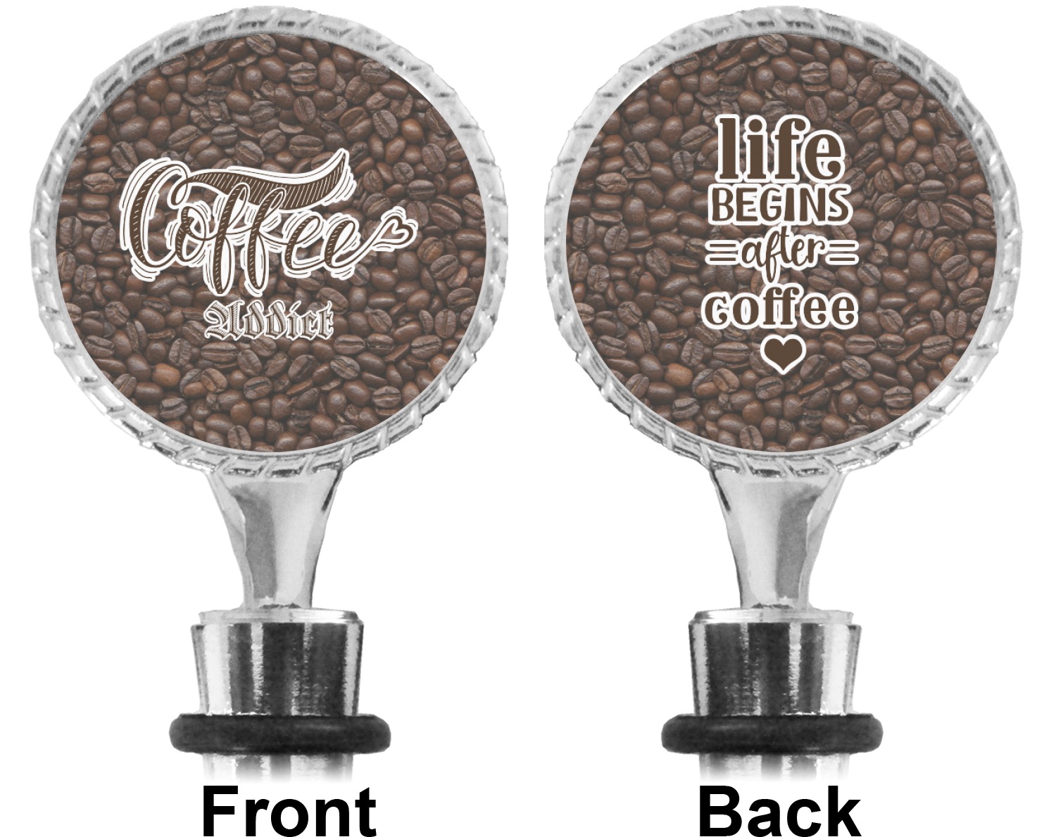 The top part of your bottle stopper is comprised of a zinc ring that displays your customization(s) in its middle, on both sides. The ring is heavy duty, with a bright chrome finish. The body of the wine stoppers have two silicone rings to provide an airtight seal. These wine bottle stoppers measure at 1.625" L x 0.8125" W x 4.625" H; your custom wine stopper is meant to fit into most standard-sized wine bottles.