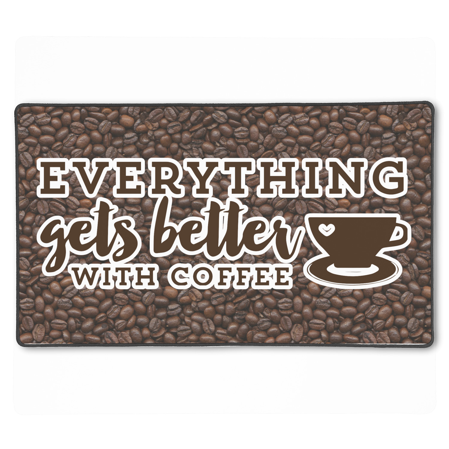 This design has a fun realistic picture of coffee beans for the background. On top of that is a fun quote saying that "everything gets better with coffee." The coordinating design has the words "coffee addict." There are also plenty of other coffee quotes to choose from in our design center.