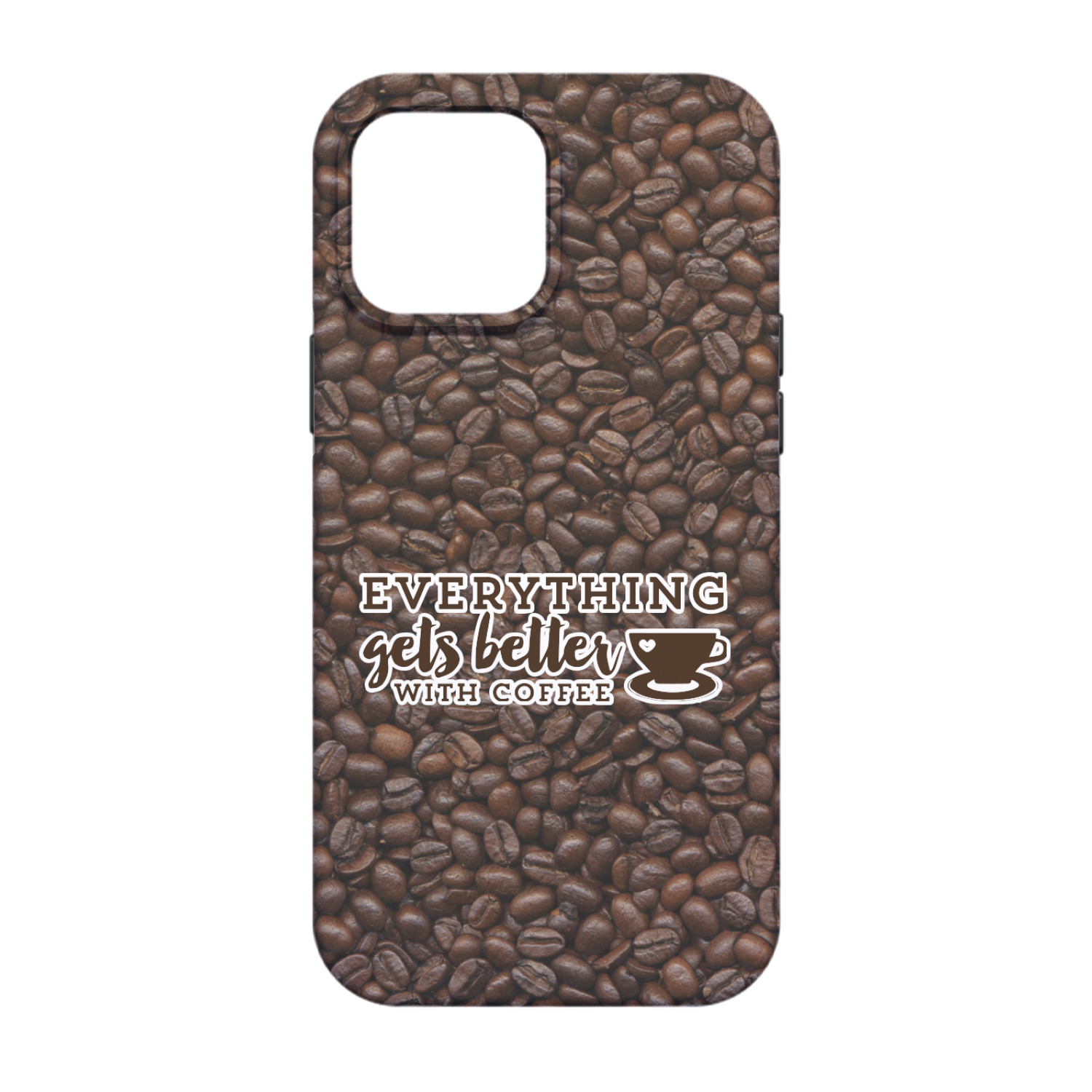 This design has a fun realistic picture of coffee beans for the background. On top of that is a fun quote saying that "everything gets better with coffee." The coordinating design has the words "coffee addict." There are also plenty of other coffee quotes to choose from in our design center.