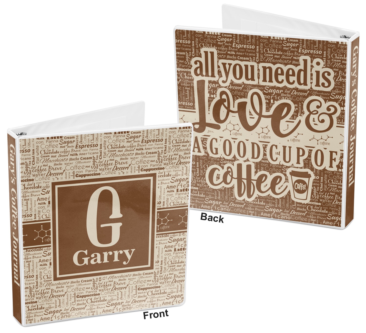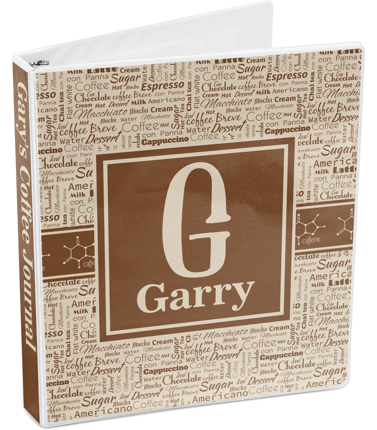 This design has a fun word cloud background with words like macchiato, sugar, coffee, latte, americano, and more. The colors are a light cream and chocolate brown. In the center is a frame where you are able to add personalization. The ribbon behind the frame has the chemical symbol for caffiene.