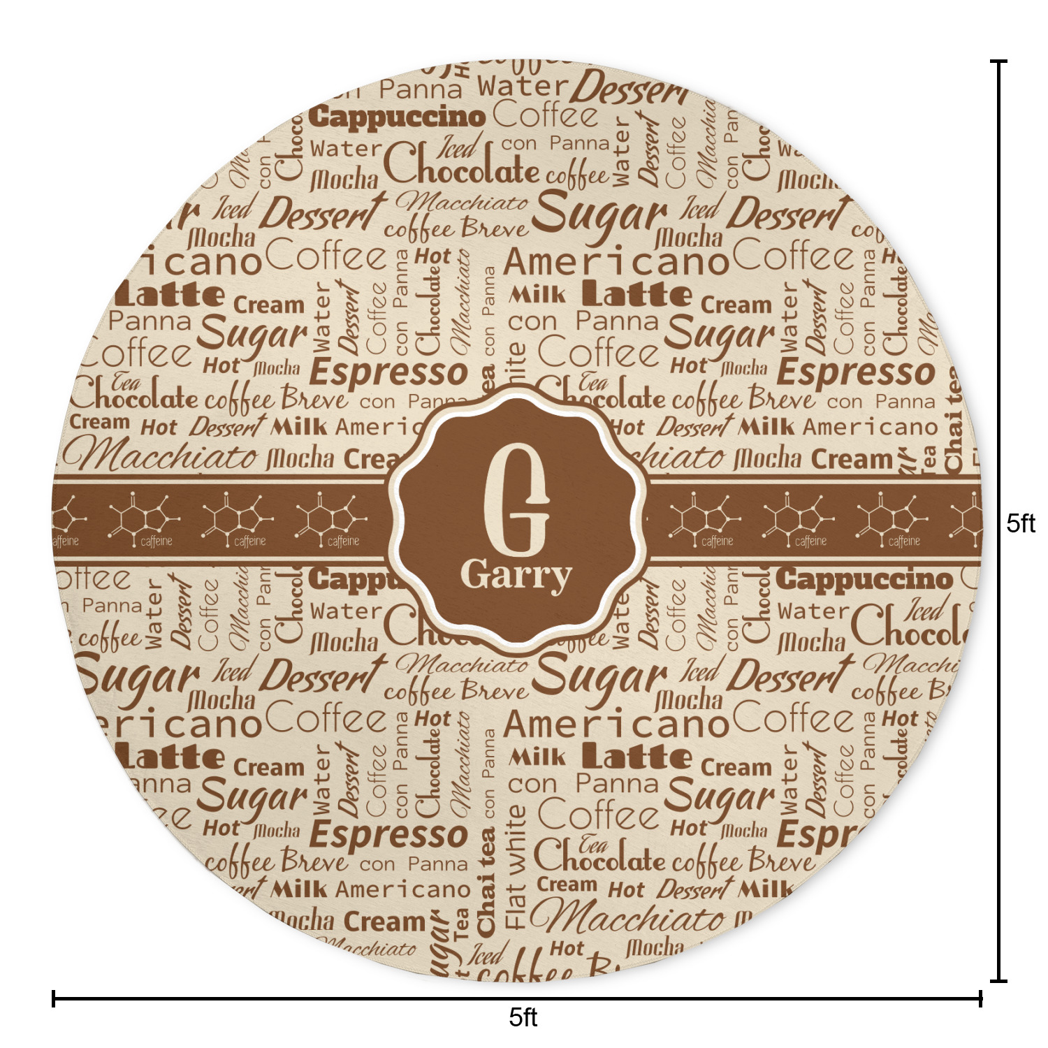 This design has a fun word cloud background with words like macchiato, sugar, coffee, latte, americano, and more. The colors are a light cream and chocolate brown. In the center is a frame where you are able to add personalization. The ribbon behind the frame has the chemical symbol for caffiene.