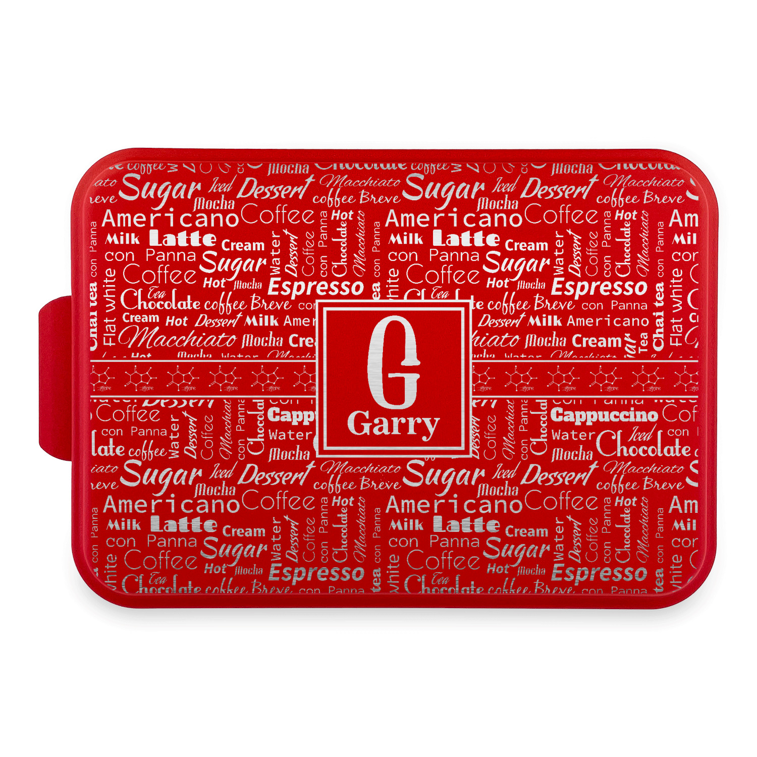 This design has a fun word cloud background with words like macchiato, sugar, coffee, latte, americano, and more. The colors are a light cream and chocolate brown. In the center is a frame where you are able to add personalization. The ribbon behind the frame has the chemical symbol for caffiene.