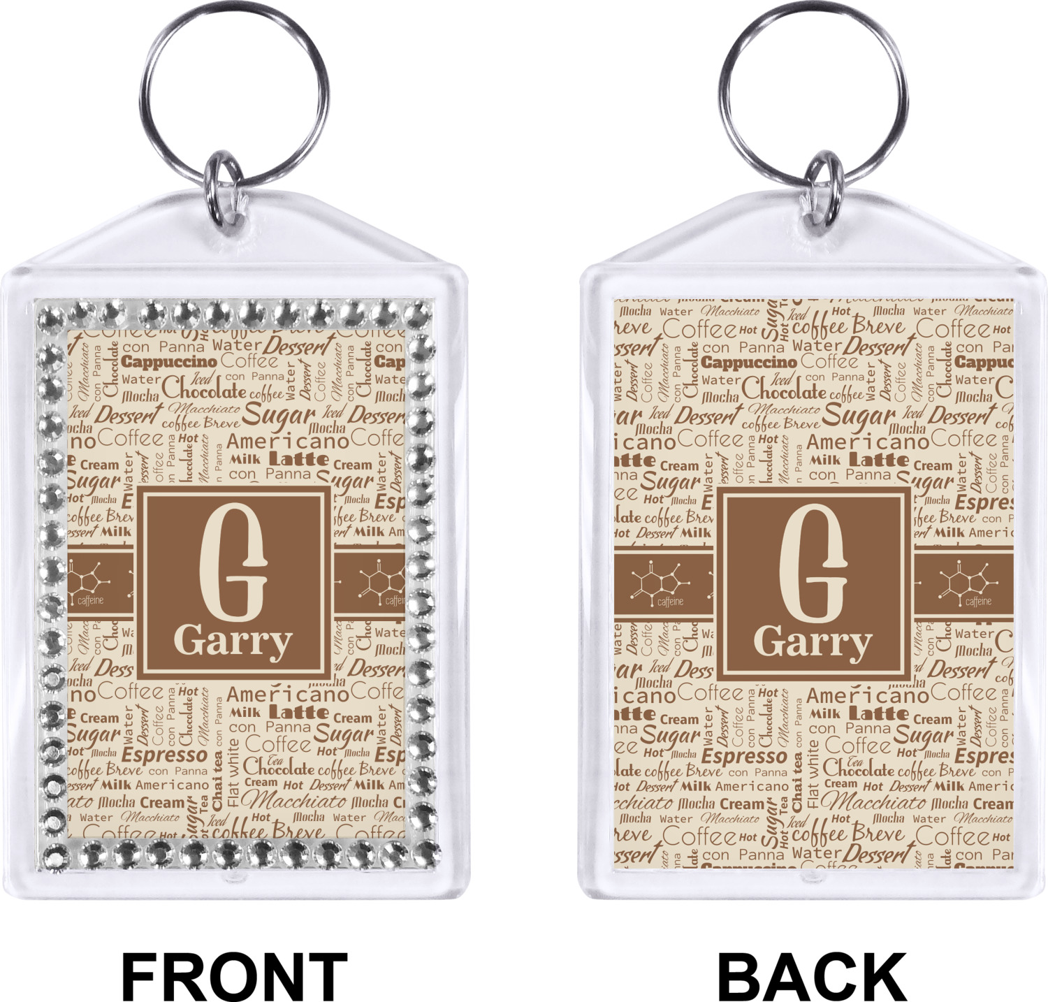 Our personalized keychains have a bold, rectangular shape, outlined by a series of shimmering rhinestones. A metal, split keyring is included with your purchase, and an additional metal hoop allows for attachment of the keychain to the split ring. This unique keychain measures at about 3.75 by 2.5 inches. We print your customized design(s) across both the back and front of this keychain.