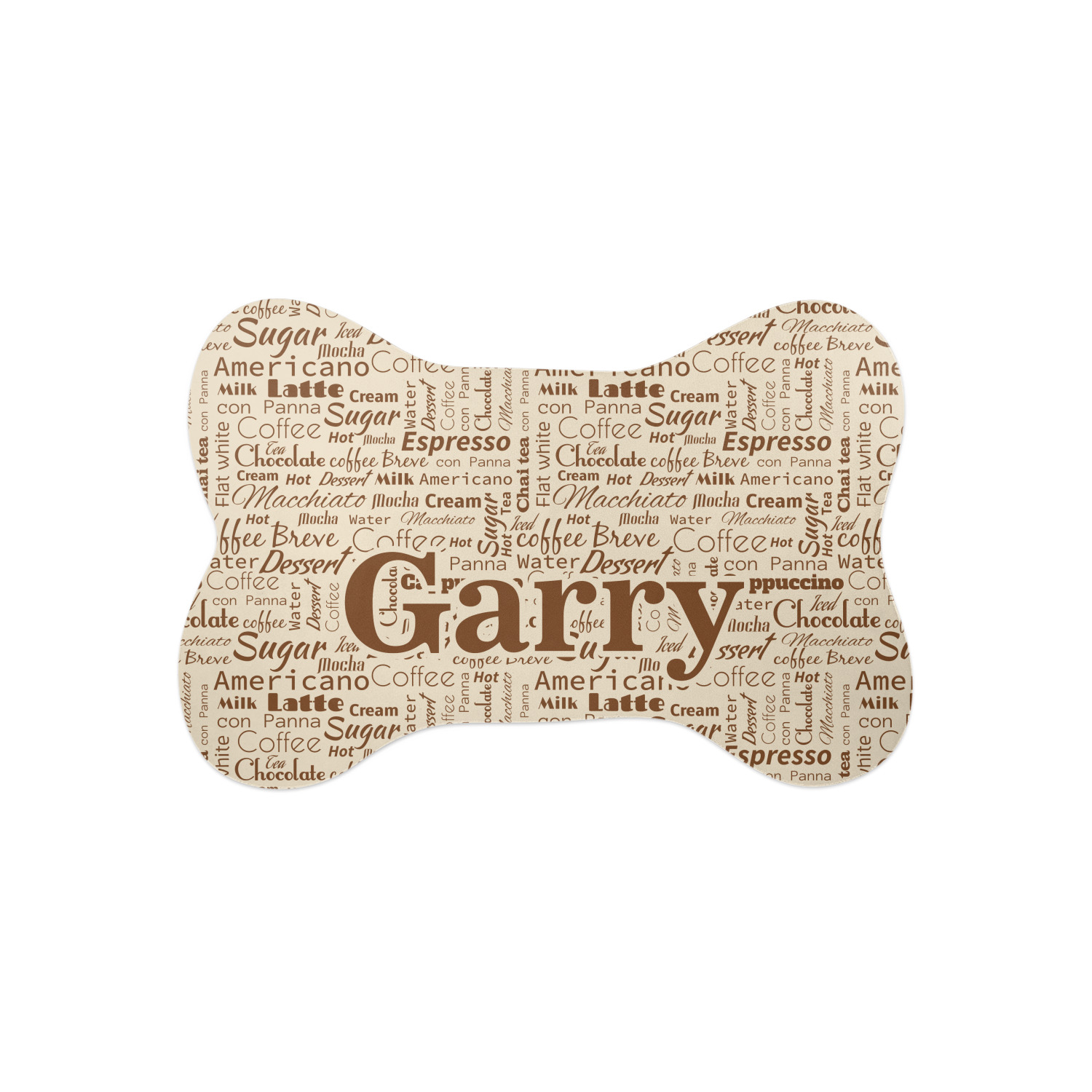 This design has a fun word cloud background with words like macchiato, sugar, coffee, latte, americano, and more. The colors are a light cream and chocolate brown. In the center is a frame where you are able to add personalization. The ribbon behind the frame has the chemical symbol for caffiene.