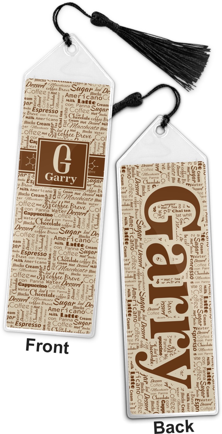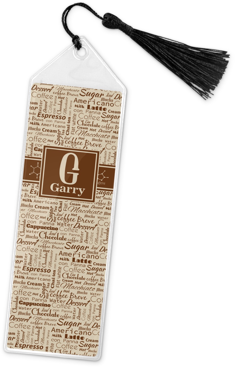 Your personalized bookmark is made of a sturdy, clear vinyl, and is approximately 7.5" x 2.25". We display your personalization on vinyl inserts that are placed on both sides. Accompanying each book marker is a black, fringe tassel that attaches to the reinforced, triangular header.