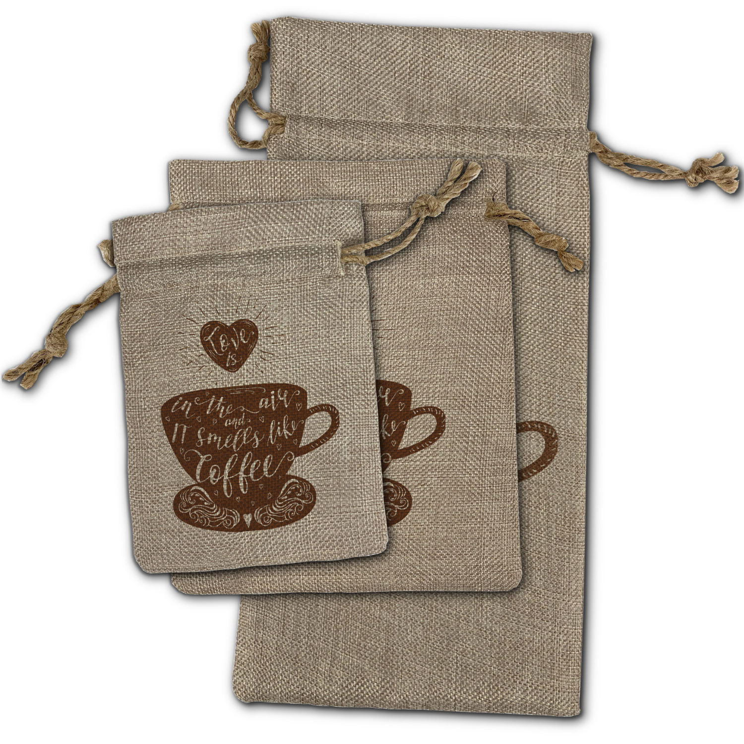 We sell our Burlap Gift Bags in 3 variant sized bags. Made with burlap polyester, each personalized bag can be secured with a twine drawstring pull. Your custom design is available to print on one side or both sides - completely up to you! The sizes of the bags measure approximately 4.5" x 6.5" for the smallest size, 6.5" x 8.0" for the medium size, and 6.5" x 13.5" for the large-sized bag.